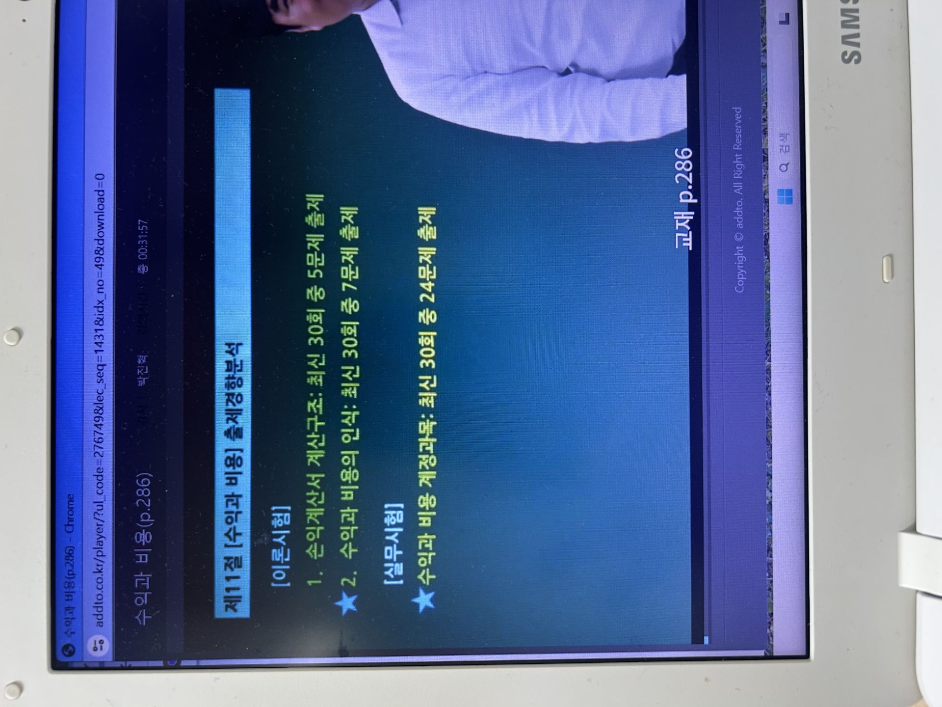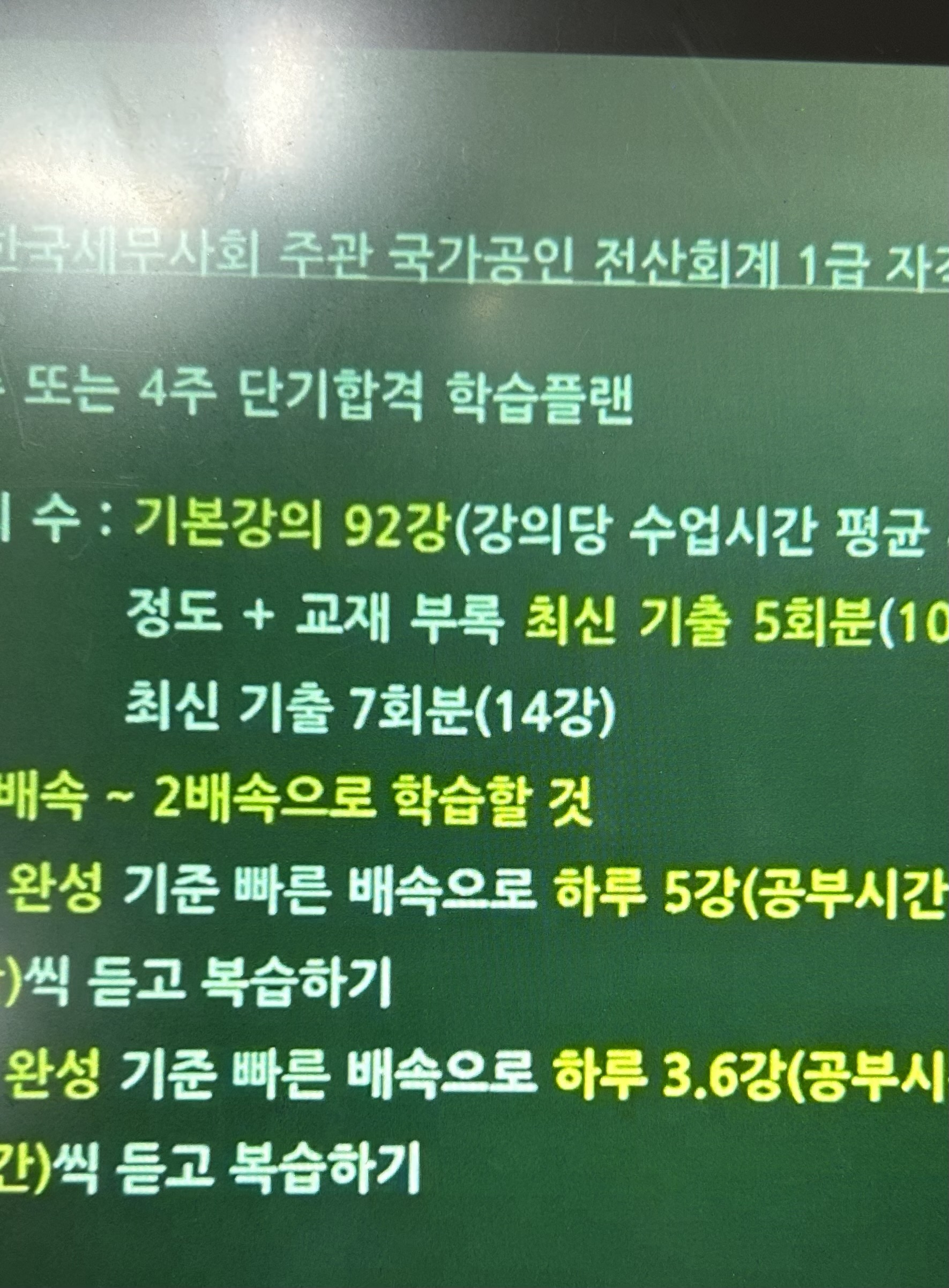 - agg5**** / 2024-01-31 BEST 전산회계1급 4주차의 강의중에서 3주차까지 진행했습니다. 강의는 애드투 박진혁 선생님께서 강의해주셨습니다. 회계1급 책에는 시험에서 주로 출제되는 비교문제를 표로 그려줘서 헷갈리지 않고 외울 수 있게 도움이 줍니다. 강의는 앞에서 나온 내용을 반복해서 설명해주기 때문에 상기시키는 시간을 가질 수 있습니다. 이론강의 안에서도 실무때 사용할 코드번호를 알려줘서,되도록 풀이시간을 단축할 수 있게 해주십니다. 강의 추천합니다. 중간중간 O,x 문제를 내주셔서 핵심내용을 잘 기억할 수 있습니다.