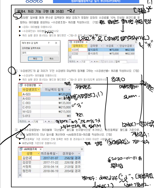 특히 액세스는 처음 들어서 처음에 따라가기 너무 힘든 거에요. 그래서 교재를 하나는 필기 있는 버전, 하나는 필기 없는 버전으로 해서 처음에 할 때는 필기 마구마구해서 밖에서도 쉽게 볼 수 있게 메모를 했구요. 하나는 필기 없는 버전으로 해서 실전처럼 연습할 때 패드 세로로 세운 후에 시험장처럼 연습했습니다!