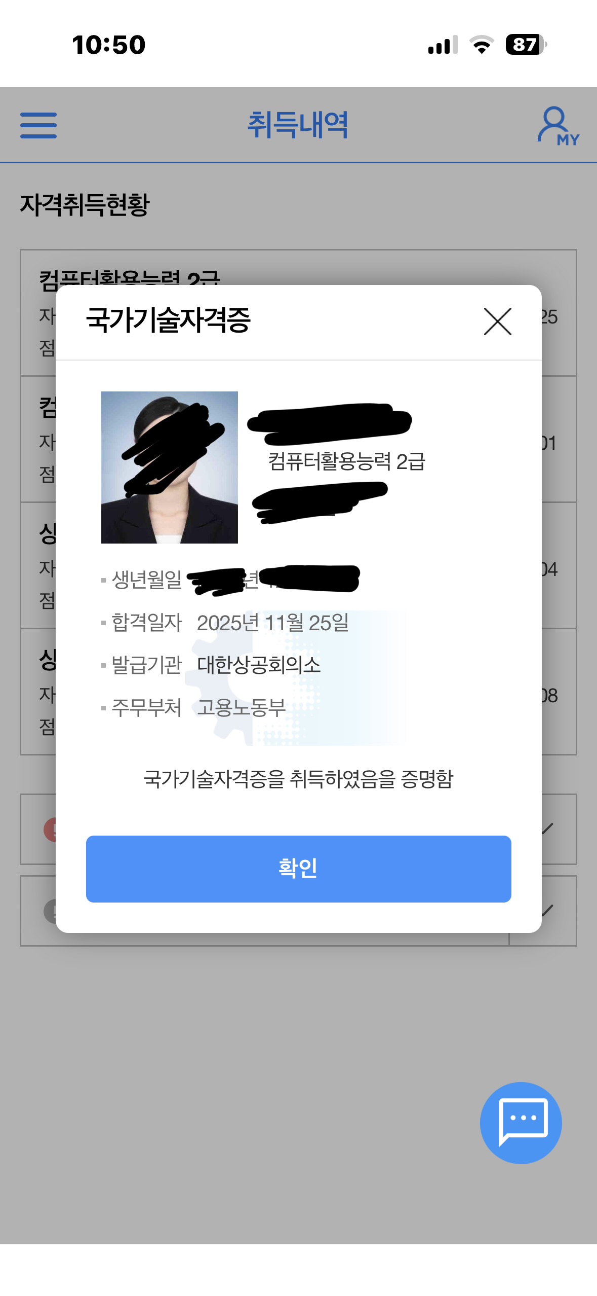 URL복사 링크가 복사되었습니다.kaka**** / 2025-10-14 *이미남 컴활 2급 필기+실기 자격증 수강후기*