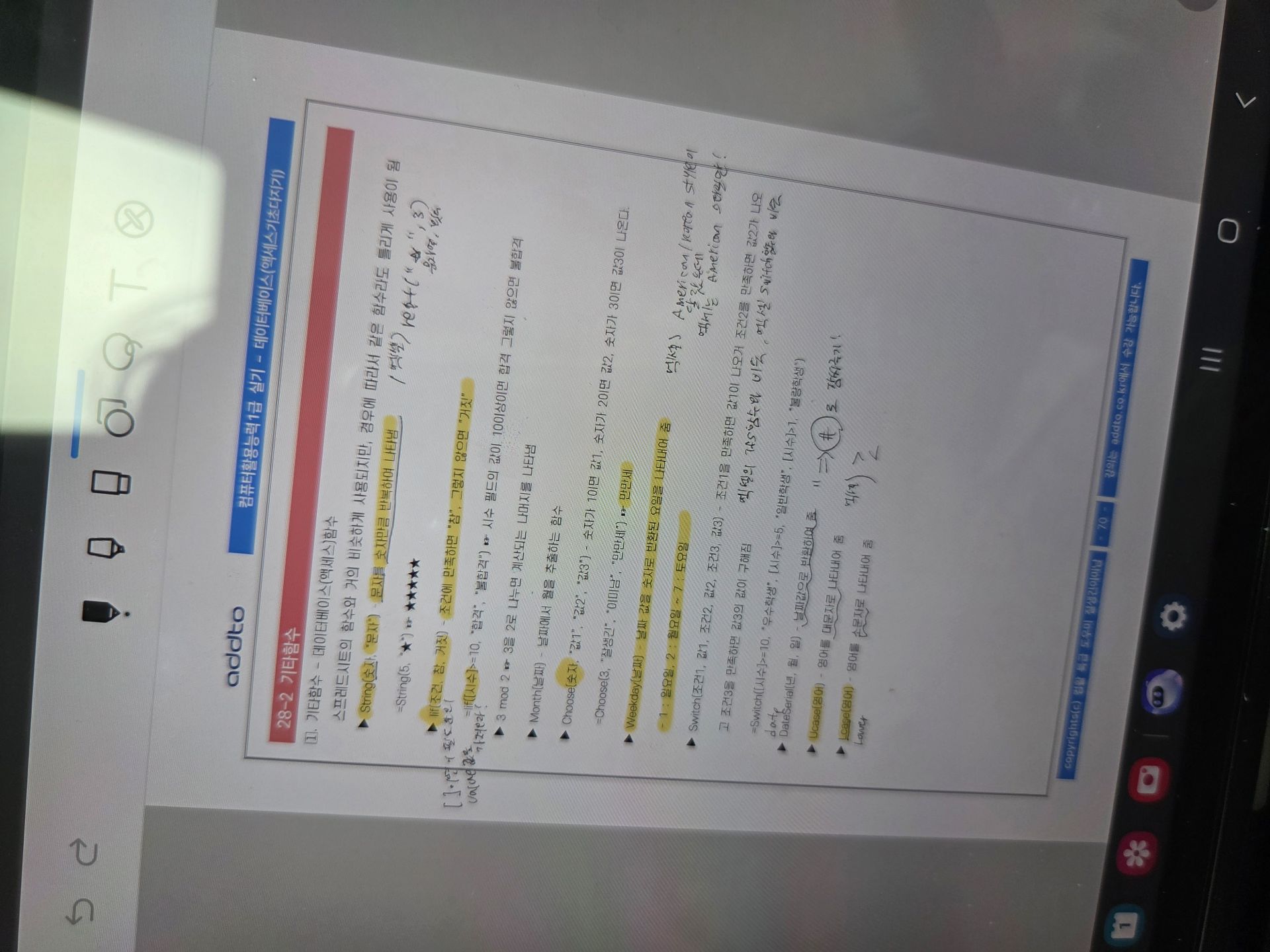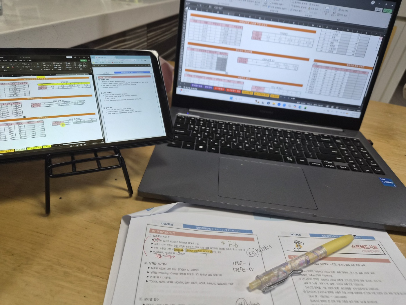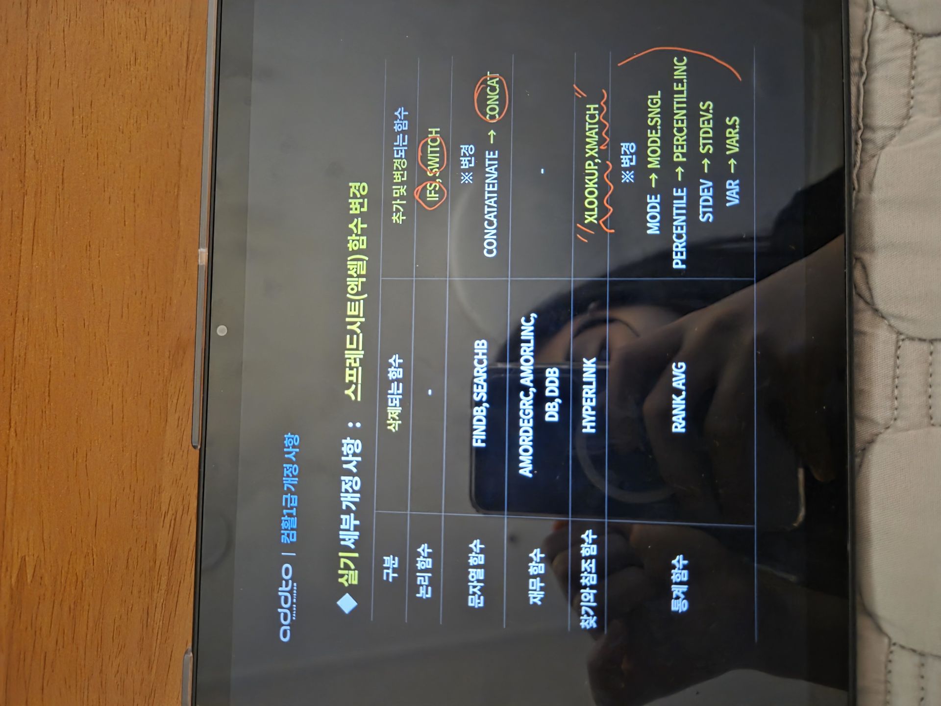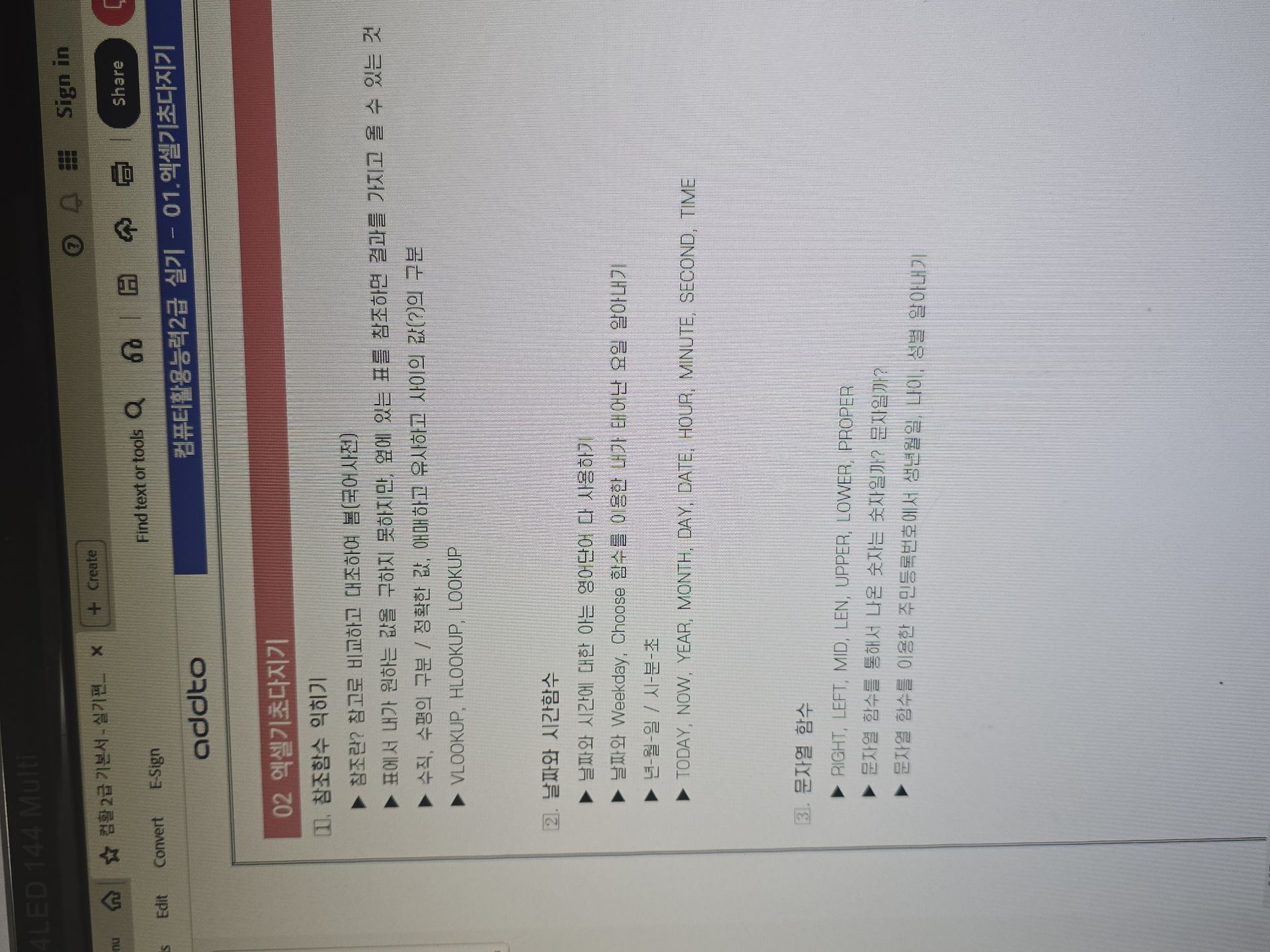 nave**** / 2025-04-01 BEST #필기+실기 *이미남 컴활 1급 필기+실기 수강 후기* 컴활 1급 실기 엑셀 함수 열공 후기!!! 컴활 1급 실기 엑셀 함수 열공중, 오늘은 2일차라 학습 커리큘럼대로 3강-5강 듣기가 목표임. 1강을 통해 column, row, number, ref - rank.EQ 함수 , range - countif 함수, array 등 함수의 영어단어들 외우기를 마쳤다. 오늘은 참조함수, 날짜 시간함수, 문자열 함수로 시작한다. 필기 때부터 날 괴롭혔던 lookup함수... 참조함수란 표에서 내가 원하는 값을 구하지 못하지만 옆에 있는 표를 참조하면 결과를 가지고 올 수 있는 것이라 한다. ++ xlookup이 추가되었다고 한다. 표를 보고 행인지 열인지 어느 값을 쓸지를 보고 V를 쓸지 H를 쓸지 선택해서 사용하면 된다. 어디에서 절대참조가 필요한지도 연습하면서 F4키 눌러준다. True(1)/False(2) 정확한 값이 필요한지 유사값이 필요한지도 구분하여야한다. VLOOKUP(lookup_value, table_array, col_index_num, [range_lookup]) 샘 강의 듣고 오늘자로 뽀갠다!!!! 필기는 2트로 냅다 따버렸지만 독학 실기의 벽에 가로막힌 나에게 단비같은 애드투 강의가 내려왔다... 아예 컴활 다시 공부할 생각도 안하고 있어 외웠던 함수들도 까먹고 있었는데.. 차근차근 짚어주시는 애드투 이미남 선생님... 감사합니다 흑흑 ​
