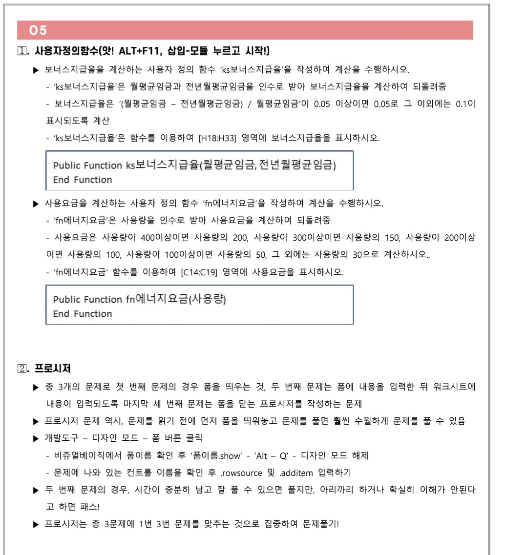 애드투 플랫폼의 이미남 컴활1급 실기 강의의 3주 완성 커리큘럼을 지난주 월요일부터 쫒아가고 있는데요, 오늘은 기출문제 5회차를 풀어봤습니다. 상공회의소에서 공개한 문제라 실전과 유사한 기출문제라고 합니다! 이제는 다 했던 내용들의 반복들이라 not, ierror, replace 함수를 새로 써본 것 말고는 새로운 것이 없네요 ㅎㅎ 그래도 점점 더 실력이 느는 것 같아 기분이 좋습니다! 다음 시간부터는 엑세스 시작인데, 새롭기도 하면서도 좀 걱정되네요 아예 처음 해보는거니... 아래에 수업 복습용 메모를 올려두겠습니다 친구랑 논다고 원래 포스팅을 어제 했어야 했는데 하루 또 미뤄버렸네요 ㅎㅎ... 기사 실기시험과 컴활 실기 두 마리 토끼를 잡겠다는 제 목표가 목표만으로 끝나지 않길 바랍니다 :)