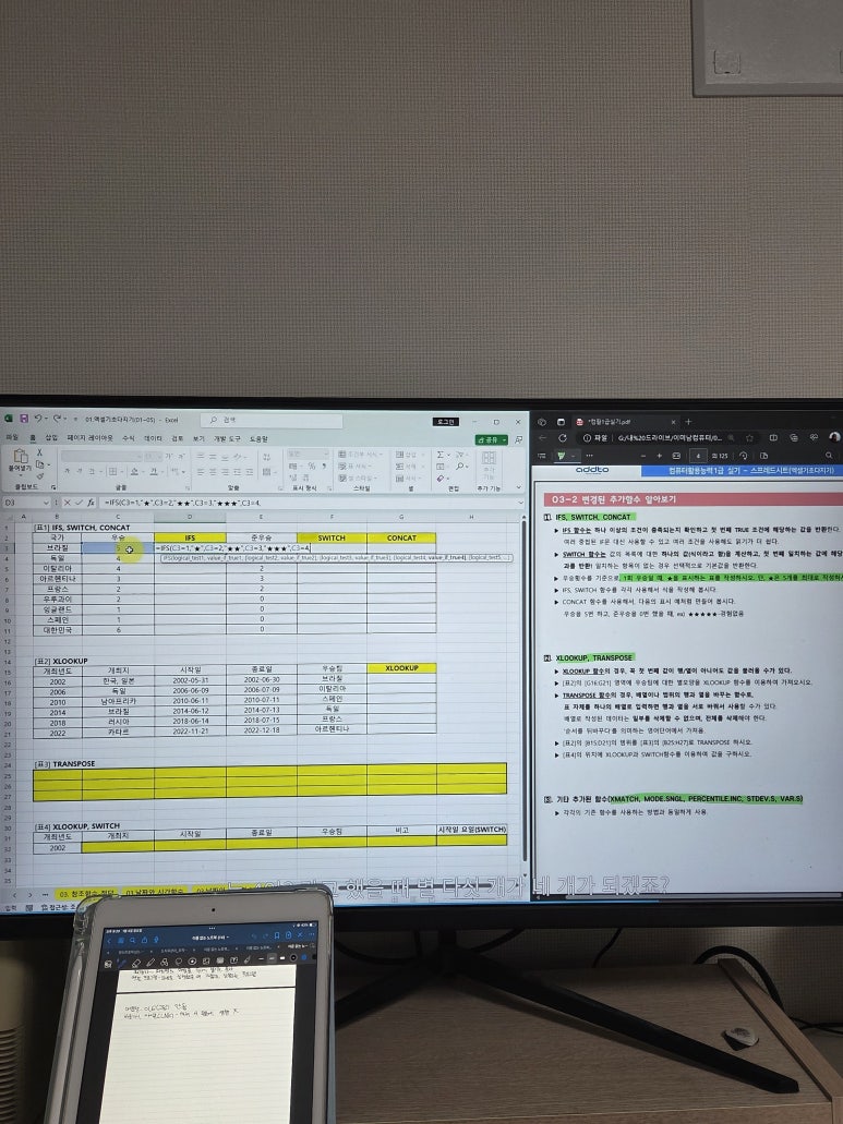 그냥 감(?)과 익숙해서 쓰는 함수만 썼다. 이미남 선생님의 강의를 쭉 들으며 기초부터 차근차근 정리해나가서 안심이 됐다. 예제 파일로 강의를 보면서 직접 한문제씩 같이 풀어보는게 큰 도움이 되었다. 특히 PDF 파일 기본서에 헷갈리는 부분과 기억해두면 좋은 팁들도 필기하면서 공부하니 효율이 2배였다.