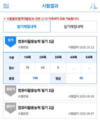 URL복사 링크가 복사되었습니다.kimi**** / 2025-10-11 #커리큘럼이 좋아요 #이해가 잘돼요 #딕션이 좋아요 #적절해요 #필기+실기 내돈내산 컴활2급필기실기 합격후기