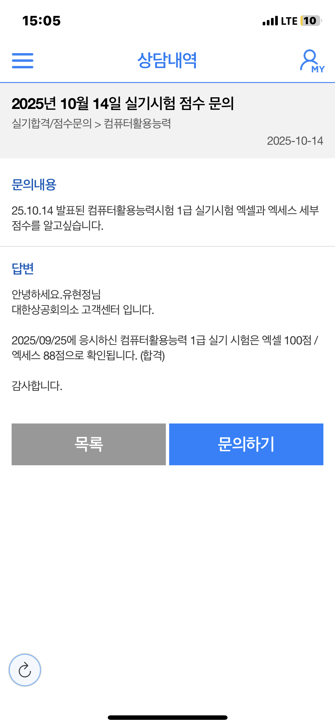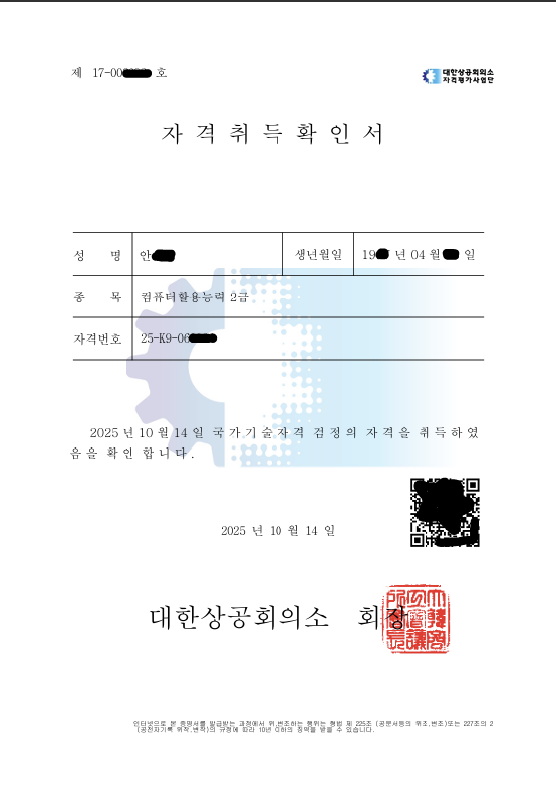 공부를 이어가면서도 지치거나 막힐 때가 있었는데, 선생님의 차분하고 친근한 설명 덕분에 끝까지 포기하지 않고 학습을 이어갈 수 있었습니다. 무엇보다도 “컴활은 꾸준히 연습하면 반드시 합격할 수 있다”는 격려가 큰 힘이 되었습니다.
