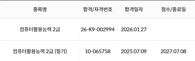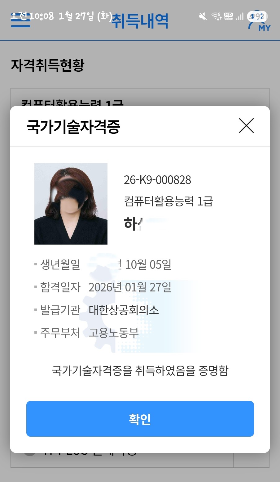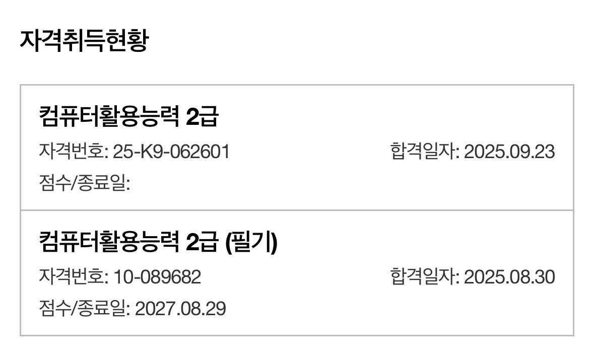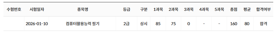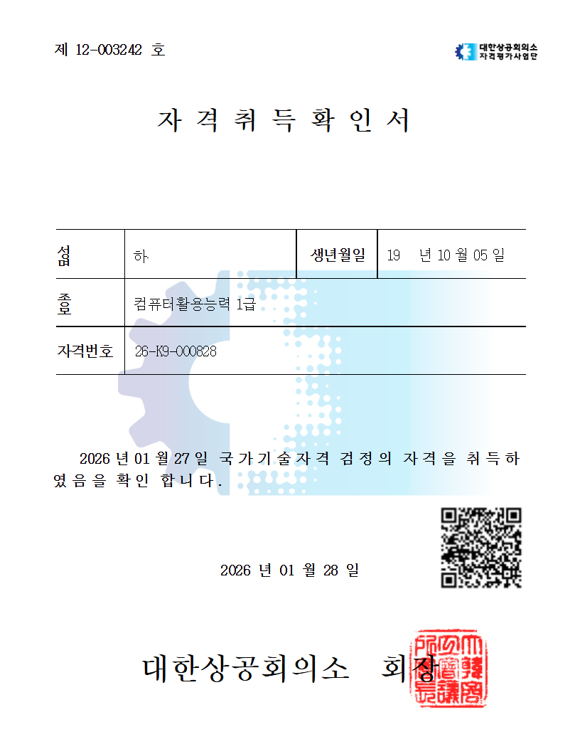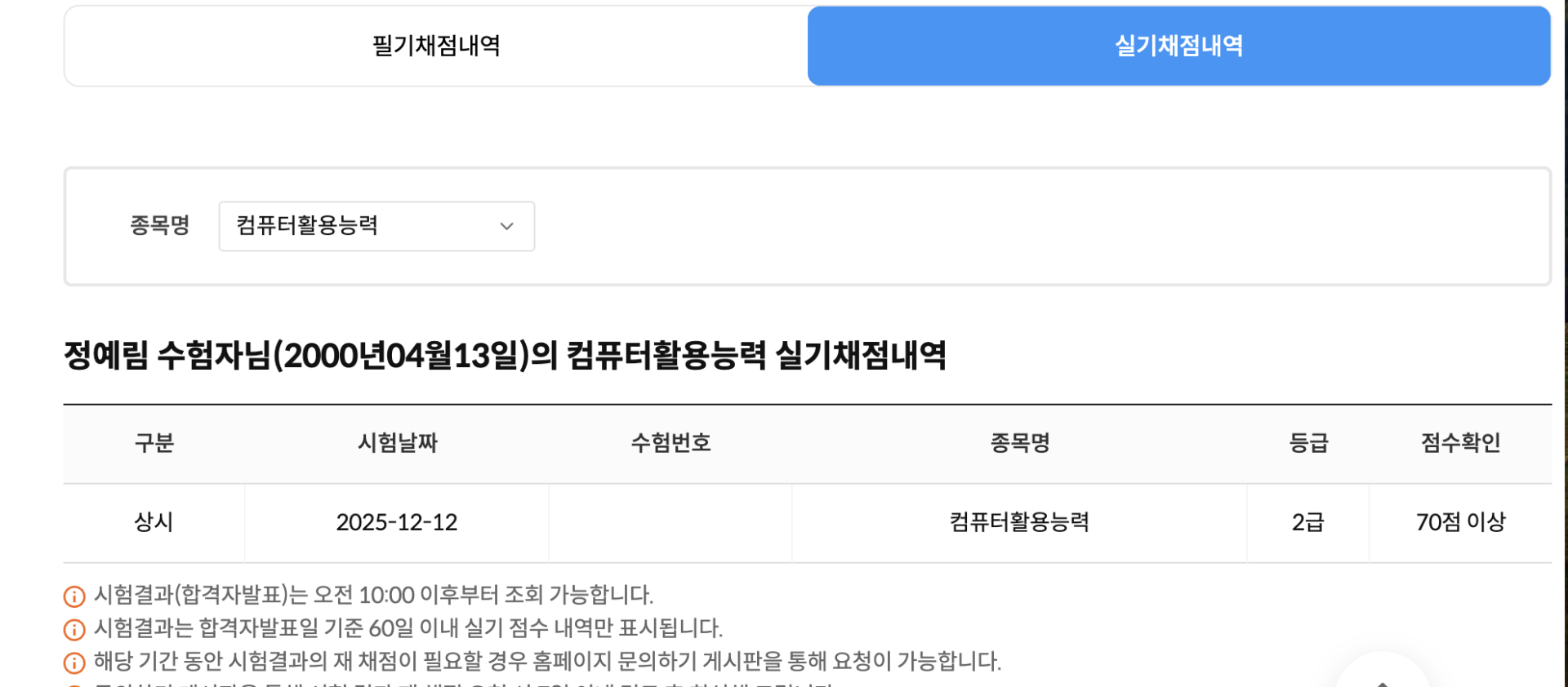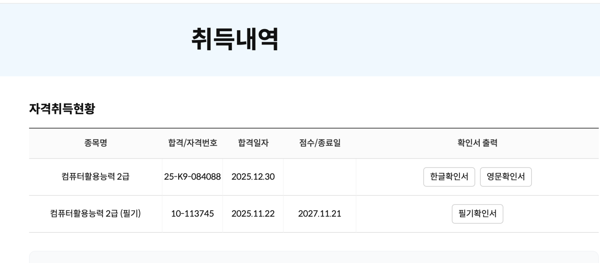[ 내돈내산 ! 컴활 2급 ! 필기 / 실기 합격 후기 !!!! ] 환갑이 넘은 나이에 국가자격증 취득에 도전 하였네요. 너무 늦은 나이에 기억력과 타자능력이 걱정이 많이 되었지만 도전을 결심하고 혼자 공부하여 취득하기는 너무 힘들 것 같아 인터넷, SNS등 여기저기를 찾아보다가 "애드투 이미남 컴활"에 딱 꽂혀서 바로 수강 신청을 하였습니다. "내돈내산" 컴퓨터 활용 2급 자격 조기 취득을 목표로 인강을 통한 투자가 필요 할 것 같아 "내돈내산 애드투 이미남 컴활 과정"을 수강신청하여 공부을 하였네요. 그렇게 비싼 비용은 아니었어요 1급은 무리인 것 같아서 "컴퓨터활용2급 자격 필기/실기"를 준비 하였습니다. 25년 4월 15일에 수강신청하여 우선 필기을 준비 하였고 4월30일 필기시험 접수하여 "응시 횟수 1회만에 15일 공부하여" 합격 하였네요 필기 합격하고 5월20일 실기시험 접수하고 "응시횟수 1회만에 15일 공부하여" (5월초 연휴 휴무는 놀았어요. . . . ㅎㅎㅎ) 실기시험도 합격, 최종 자격 취득 하였습니다. "필기 합격 공부법"은 인강을 충실히 수강하면서 애드투에서 제공한 자료 및 모의테스트을 2회이상 반복 공부 하였습니다. "실기 합격 공부법"은 실기가 많이 부족하기때문에 특별히 더 공을 들여 공부시간을 필기 준비 시간의 3배는 투자한 것 같아요. 일단 인강 전과목을 충실히 1회 들은후, 2회차 부터는 먼저 스스로 문제을 풀어보고 인강을 다시 듣는형태로 하였고, 인강 전과정을 총 3회 반복 학습 하였네요 무엇보다도 교재의 내용이 충분히 좋았고 특히 이미남강사님의 쉬운 설명과 중요한 사항의 반복 설명은 많은 도움이 되었습니다. 늦은나이에 타자 및 실기 능력이 떨어져서 많이 걱정하였는데 필기, 실기 총 한달여만에 단 1번씩 응시하여 자격을 취득한 것은 애드투의 충실한 교재내용과 이미남강사님의 탁월한 강의 덕인 것 같습니다. 애드투 이미남컴활을 선택 한 것은 너무 잘 했던 것 같습니다. 이내용을 빌어 감사드려요~~~ 시험 합격 인증 사진 첨부 합니다.
