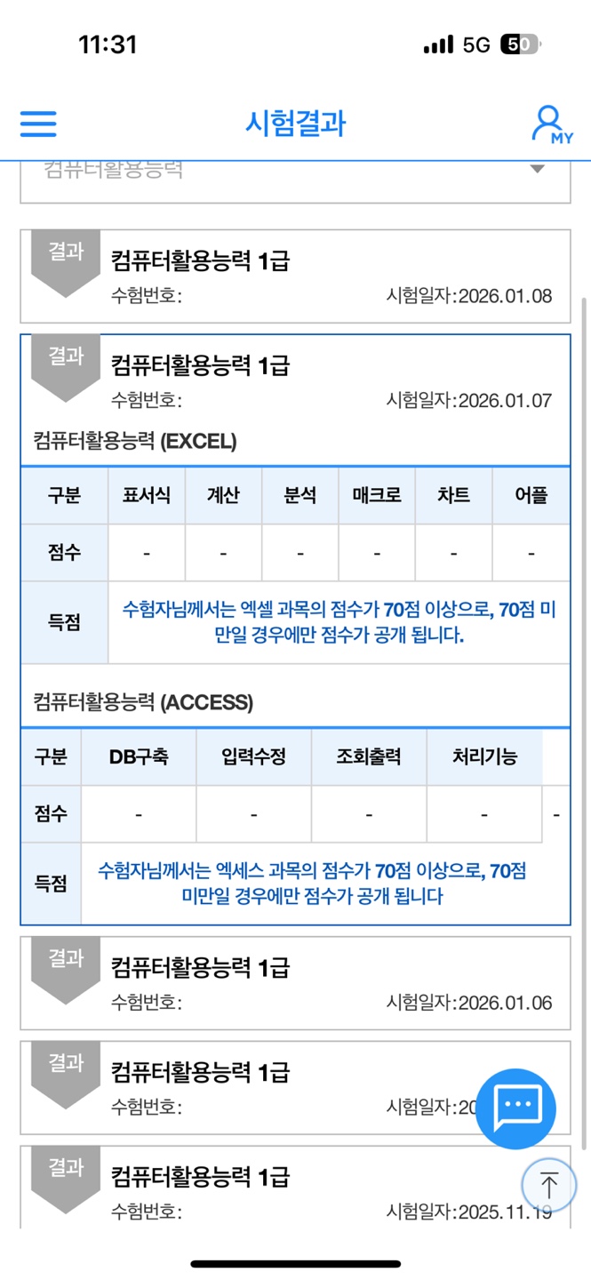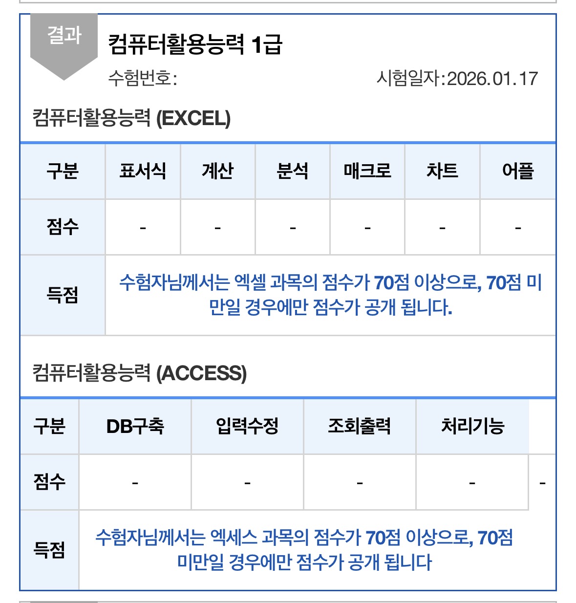 내돈내산! 컴활 1급 필기 실기 합격 후기! 드디어 취준생의 숙제와도 같았던 컴활 1급을 최종 합격했습니다! 노베이스 상태에서 시작하느라 걱정이 많았는데, 직접 강의를 비교해보고 선택한 내돈내산 후기를 생생하게 남겨보려 합니다. 결론부터 말씀드리면 덕분에 생각보다 빠르게 자격증을 손에 넣을 수 있었습니다. ​ 1. 응시 정보 및 준비 기간 - 응시 급수: 컴활 1급 (필기 & 실기) - 응시 횟수: 필기 2회, 실기 3회 - 준비 기간: 총 6주 (필기 1주 + 실기 3주) ​ 2. 필기 합격 공부법 필기는 문제 은행 방식이라고는 하지만, 1급은 개념 이해 없이 기출만 돌리기엔 양이 너무 방대했습니다. - 공부 방법: 의 실기 강의를 먼저 수강하며 DB, OA의 전체적인 흐름을 파악했습니다. 그 후 최근 5개년 기출문제를 반복해서 풀며 오답 노트를 정리했습니다. - 도움이 된 점: 이미남 선생님께서 시험에 자주 나오는 핵심 키워드를 딱딱 짚어주셔서 공부 범위를 획기적으로 줄일 수 있었습니다. 특히 2과목 스프레드시트의 생소한 함수들을 이해하는 데 큰 도움이 되었고 생소한 데이터베이스를 이해하는데 도움이 되었습니다. ​ 3. 실기 합격 공부법 실기는 정말 '손에 익히는 것'이 중요했습니다. 엑셀과 액세스라는 생소한 프로그램을 다루는 게 쉽지 않았지만, 커리큘럼을 믿고 따라갔습니다. - 공부 방법: 먼저 강의를 보며 기능을 하나하나 따라 해본 뒤, 2회독부터는 강의 없이 스스로 문제를 풀었습니다. 막히는 부분만 선택적으로 강의를 다시 보며 약점을 보완했습니다. - 이미남 컴활 활용법: 이미남 선생님의 강의는 설명이 매우 친절하고 깔끔합니다. 자칫 복잡할 수 있는 배열 수식이나 프로시저 작성을 수험생 눈높이에서 쉽게 설명해 주셔서 포기하지 않을 수 있었습니다. 특히 실제 시험장과 유사한 상설 복원 문제 풀이가 실전 감각을 키우는 데 결정적인 역할을 했습니다.