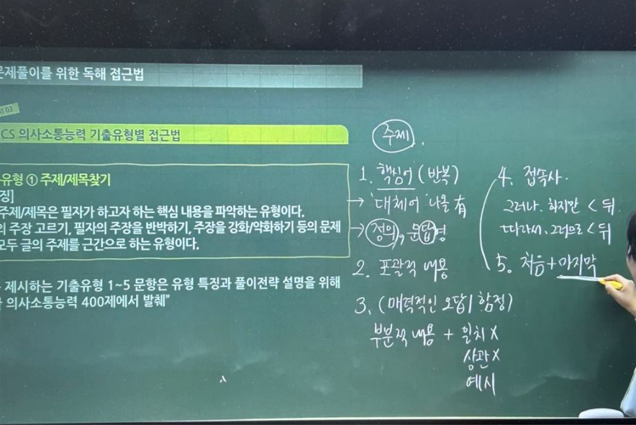 길자은 선생님의 의사소통강의는 의사소통 영역은 단순히 읽고 푸는 것이 아니라, 스킬을 활용해야한다는 걸 알려주시면서 기본서내용을 적절히 뽑아서 개념을 설명해주세요! 또한, 해설지에서 필요한 부분 강사로서 공감되었던 풀이를 설명해주셔서 좋았습니다.