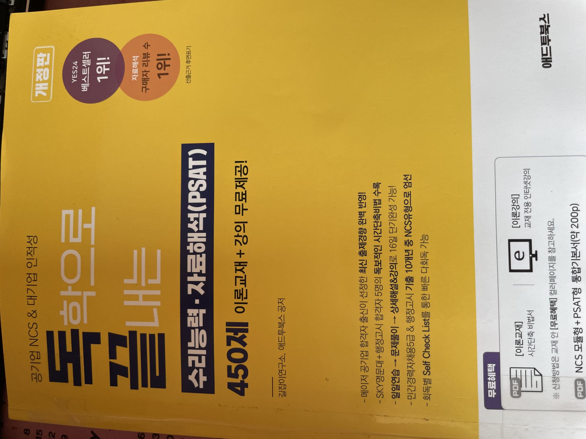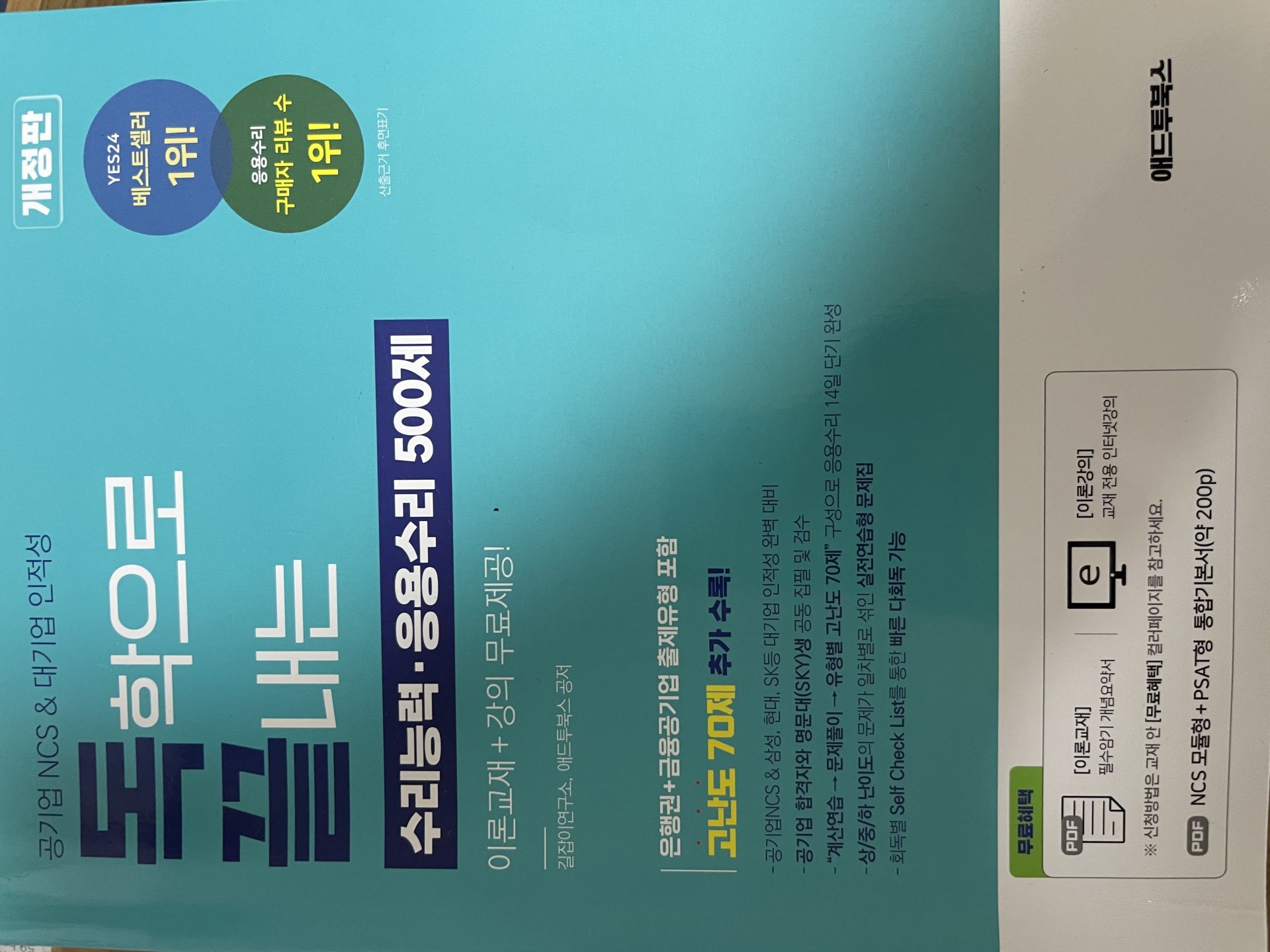 취준이 처음이라 너무 막막하고 응용수리 특히 수포자 가까운실력이었는데 무료강의 신청해서 한줄기 빛을 보았습니다ㅠㅠ기본강의 듣고 문풀 하루씩 한다음 모르는거 위주로 듣고있는데 실력올라오는게 느껴집니다!!! 무엇보다도 직접 적용할수 있는 풀이로 마스터키를 제시해주시고 실전에 써먹을 수 있는 것이 유용했습니다. 이대로만 따라가면 이제 응용수리가 반대로 강점이 될수도있겠다는 생각까지 들었습니다. 알려주신대로 꾸준히 연습하면 그런날이 오겠죠?! 자료해석이랑 문제해결능력도 독끝시리즈로 함께 극복하려고 합니다! 해설도 자세한 해설 뿐만 아니라 실전팁, 풀이순서 등 일반문제집에서는 볼 수 없었는데 너무 자세해서 만족스럽습니다. 이런문제집은 처음이여서 계속 칭찬글만 나오네요ㅎㅎ