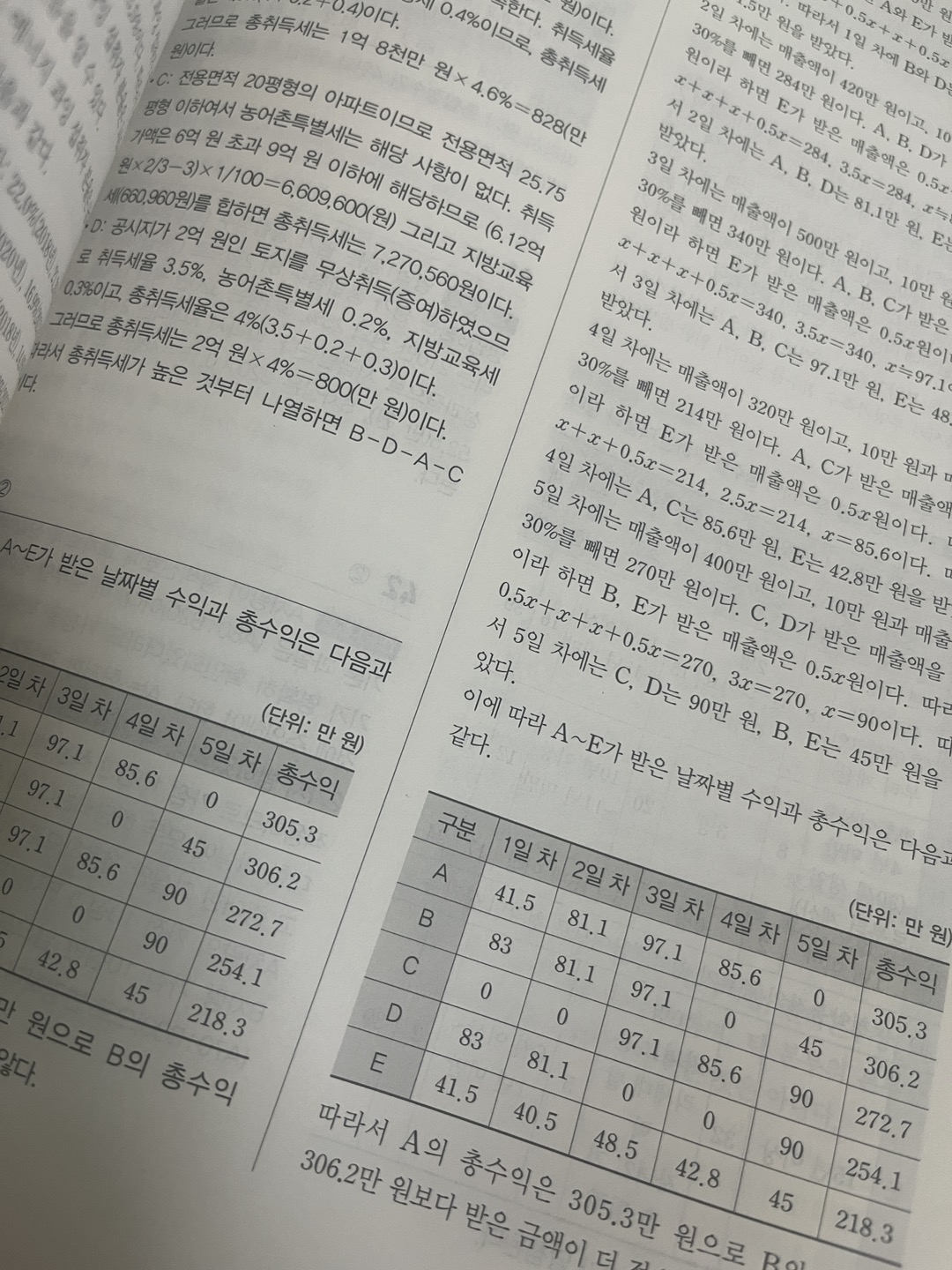 일단 자료해석 영역은 다양한 유형의 문제들이 있어 많은 문제들을 접하는 경험을 쌓을 수 있었습니다. 그리고 문제 풀이에 적용할 수 있는 방법이나 확률표 등 문제에 적용할 수 있는 요소들이 해설집에 잘 나와있어서 문제에 적용하기 좋았습니다. 또한 문제지 하루치 분량을 풀기 전에 있는 계산문제들을 통해서 간단한 워밍업을 하고 문제를 푸는 습관이 정말 도움이 많이 되었습니다.
