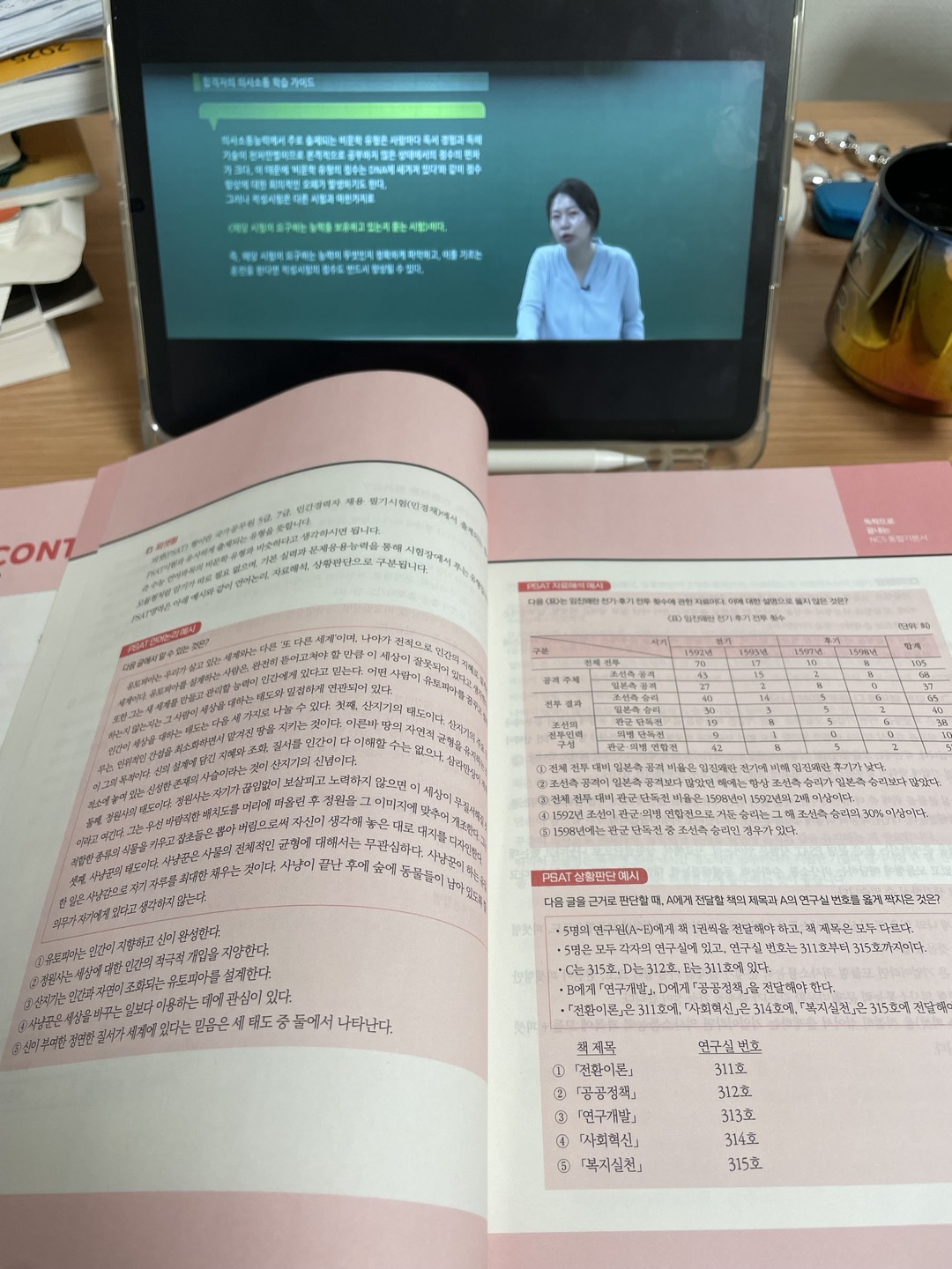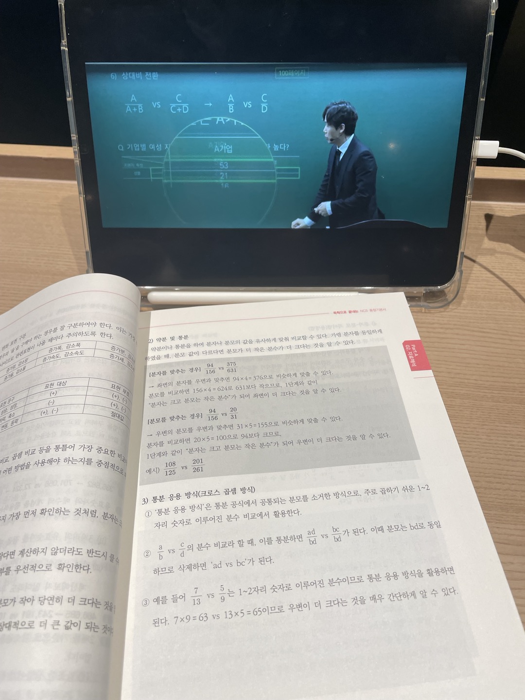 그리고 강의를 듣는데 이해도 더 잘되고 한 번더 머리 속에 각인 시킬 수 있어서 강의를 듣기 잘했다는 생각이 들었습니다. 그리고 특히 수리, 자료해석 부분에서는 어림산하는 방법을 읽히는데 강의 도움을 많이 받았습니다. 수리부분이 늘 약해서 문제를 풀 때 시간이 너무 오래걸렸었습니다. 그래서 수리는 포기해야되나 싶었는데 강의보면서 계산하는 방법을 다시 익히고 차근차근 하니까 그 전보다는 훨 빨라졌습니다. 아직 더 많이 노력해서 학습해야 강사님께서 말씀하신 시간이 걸릴거 같긴하지만 예전에 비하면 많은 발전이라고 생각합니다.