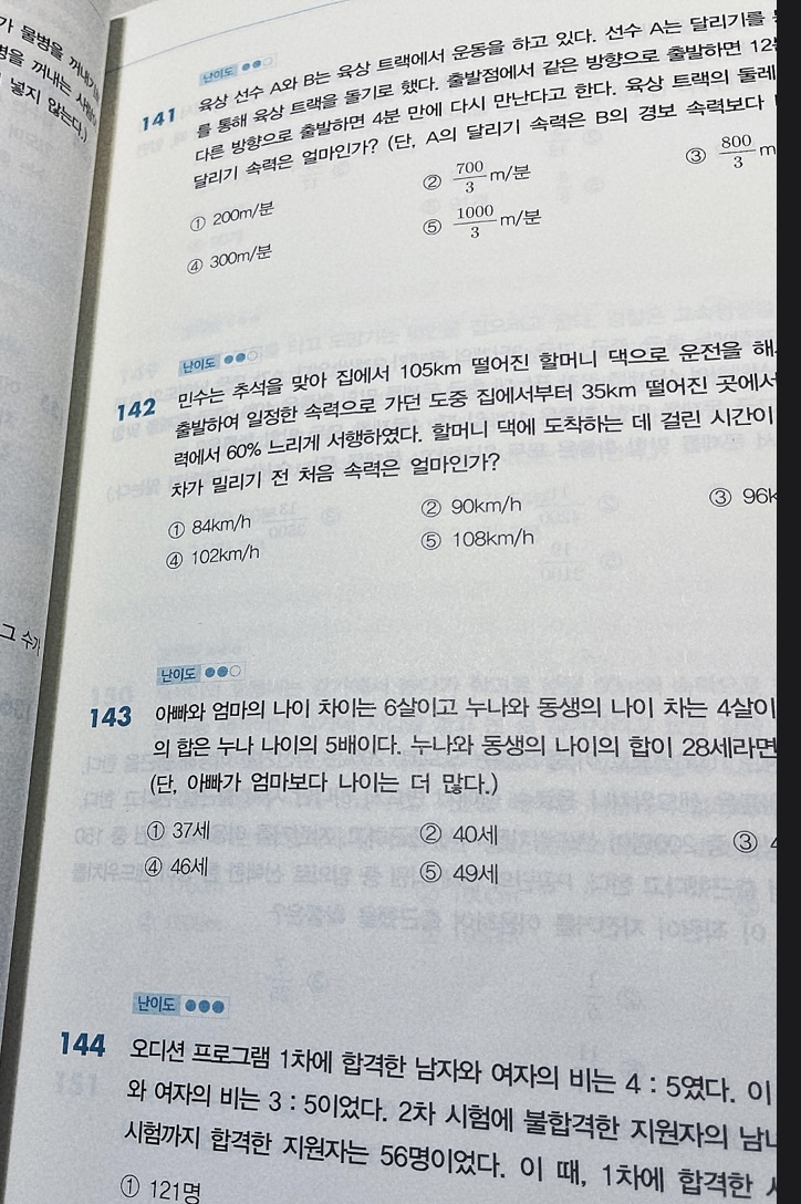 1. 응용수리 영역을 보니 중학교 때 보던 문제들이었다. 피셋엔 없는 유형인 데다 오랜만에 보니 반가워서 신나게 풀었다. 그런데 나는 이걸 20~30초 안에 풀어내야 하는 성인이다. 마찬가지로 내 경쟁자들은 모두 중학교를 졸업했다. 쉬운 문제를 더 쉽게 풀어야 한다. 정말이지 안타까운 일이 아닐 수 없다.