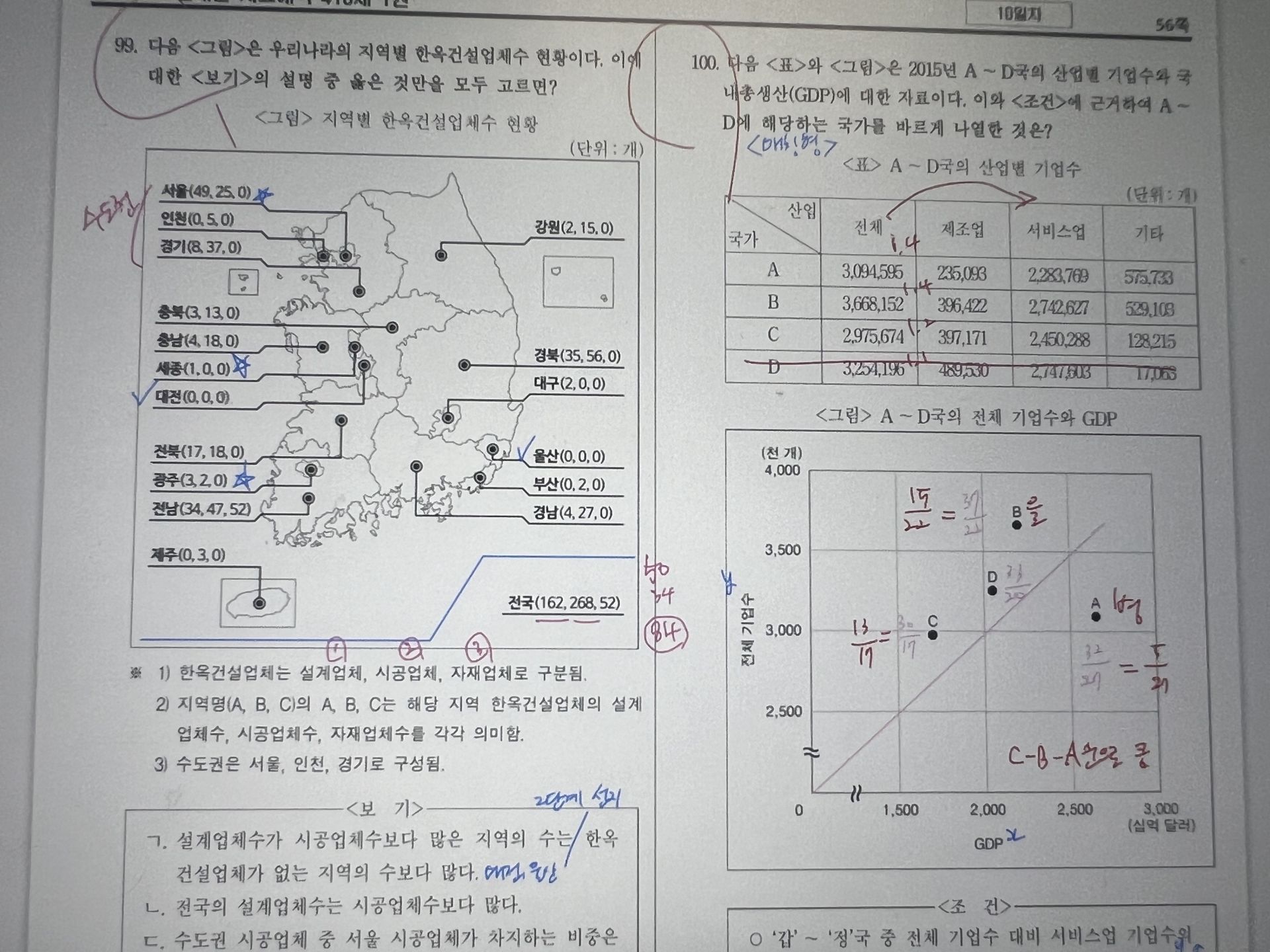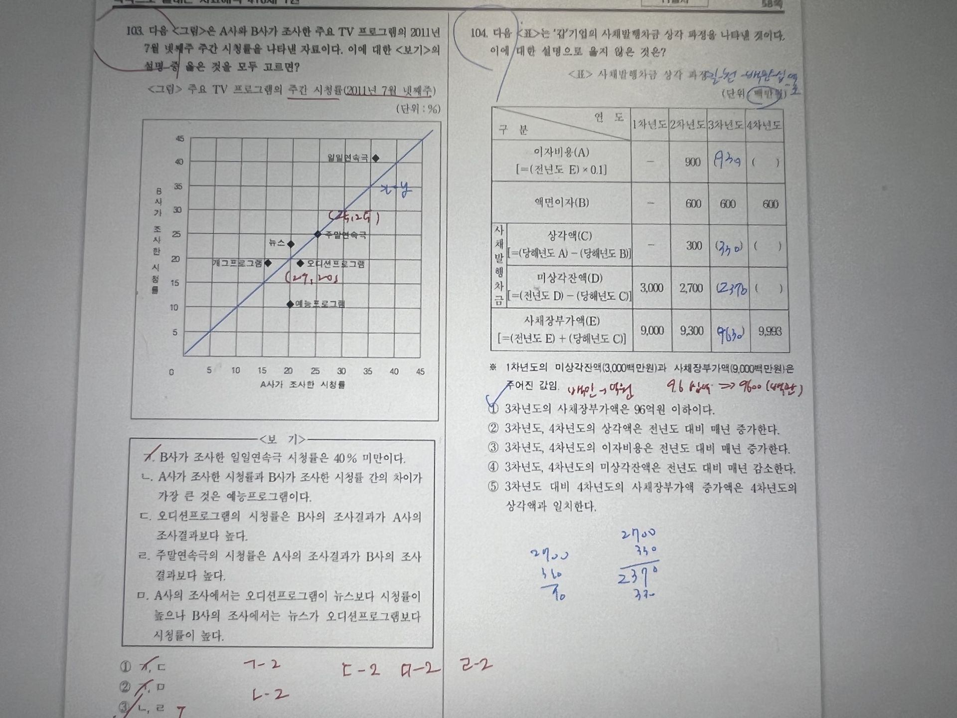2주간의 공기업 ncs 스터디가 끝났습니다. 저는 공기업 길라잡이 중 psat 자료해석 400제 파트 강의를 수강했습니다. 처음에는 그냥 문제를 보고 선지 확인 후 문제푸는 방으로 했지만 1주차부터 실전 문제풀이 방식을 배우는 게 좋았습니다. 처음에는 익숙치 않아서 오히려 생각하고 따라하느라 시간이 더 걸리긴 했는데 조금씩 유형이 눈에 보이고 익숙해지면서 조금씩 빨라지는 걸 느꼈습니다. 예를 들어 표 유형을 볼 때 각각의 요소들과 전체가 있을 때 그 사이에 선을 그어서 확인하고 일반적으로 사람이 표를 볼 때 왼쪽에서 오른쪽으로 읽는데 년도가 2011~2015년 식으로 나올 수도 있지만 2015년~2011년 식으로 거꾸로 나올 수도 있다는 걸 알았습니다. 이렇게 출제자가 함정에 빠트리는 요소도 잘 캐치해야 한다는 걸 알았습니다. 첫 주에는 필기하는 것도 힘들었습니다. 컴퓨터 타이핑로 필기했었는데 선생님 말씀하시는 게 하나하나 중요하기 때문에 요약하는 것도 오래 걸린 느낌이 있고 특히 자료해석에서는 말 그대로 자료인 표나 차트에 표시를 하면서 푸는 경우가 많은데 그런것들을 타이핑 하기에는 힘들었던 것 같습니다. 하지만 초반에 힘든 경우를 지나고 나니 점점 익숙해지면서 필기도 수월해 졌습니다. 그동안 psat 자료해석 부분은 실력이 많이 향상된 것 같습니다. 다른 교재를 풀어봐야 알겠지만 확실히 애드투에서 나온 책은 문제풀이 속도가 빨라지고 푸는 관점도 선생님과 점점 비슷해져가고 있습니다. 애드투와 전수환 공기업 카페에게 감사함을 느낍니다. 앞으로 계속 ncs스터디를 하면서 더욱 발전되도록 노력하겠습니다. 기회가 된다면 자료해석 파트 이외에 문제해결능력 자원관리능력과 응용수리능력 부분을 들어보고 싶습니다.