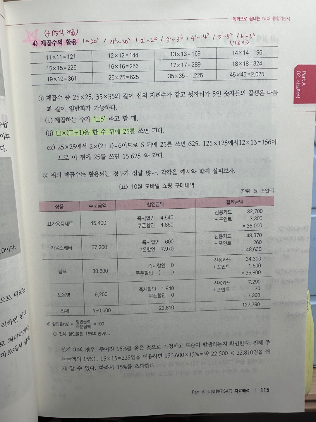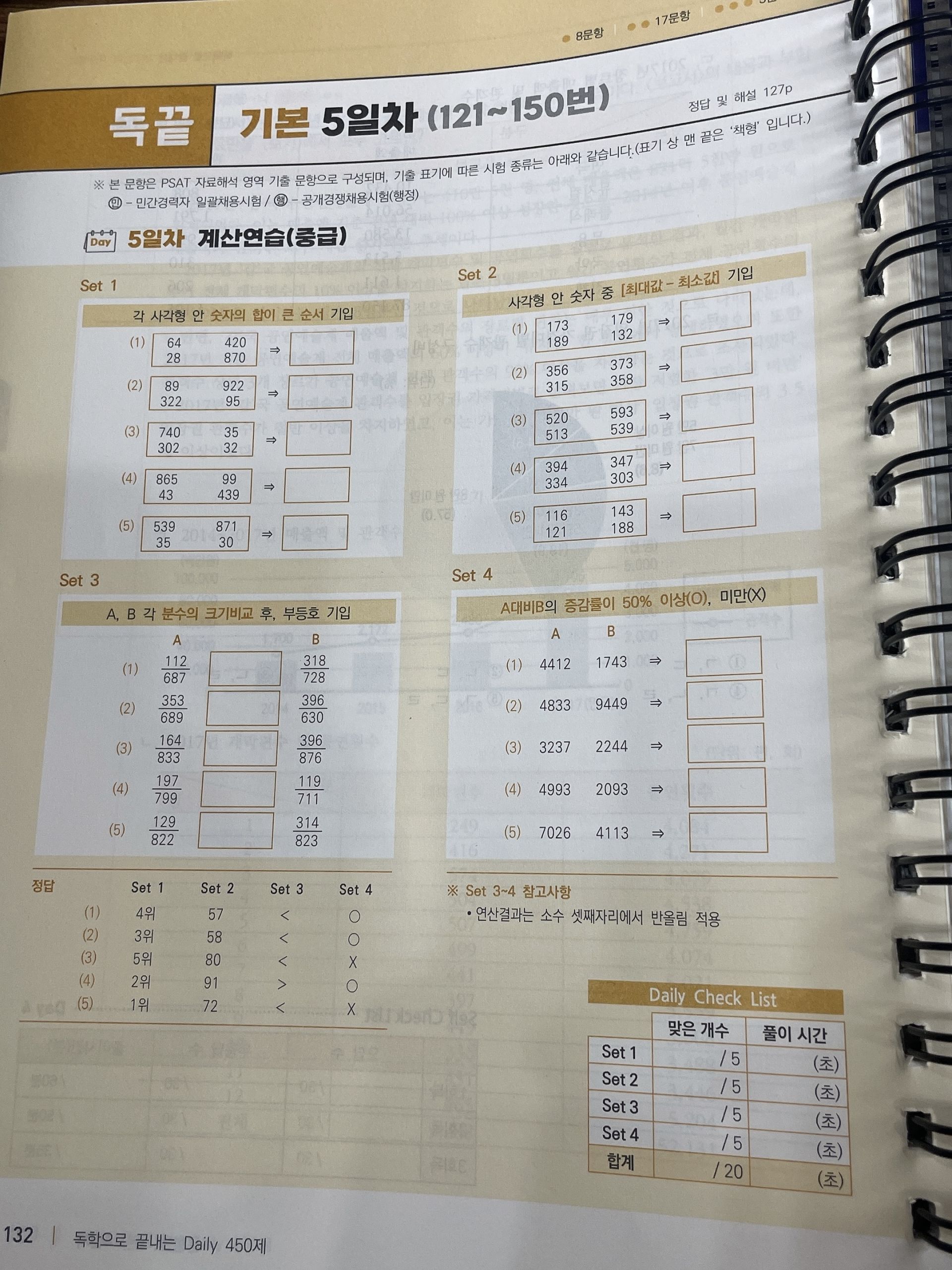 일단 자료해석 영역은 다양한 유형의 문제들이 있어 많은 문제들을 접하는 경험을 쌓을 수 있었습니다. 그리고 문제 풀이에 적용할 수 있는 방법이나 확률표 등 문제에 적용할 수 있는 요소들이 해설집에 잘 나와있어서 문제에 적용하기 좋았습니다. 또한 문제지 하루치 분량을 풀기 전에 있는 계산문제들을 통해서 간단한 워밍업을 하고 문제를 푸는 습관이 정말 도움이 많이 되었습니다.