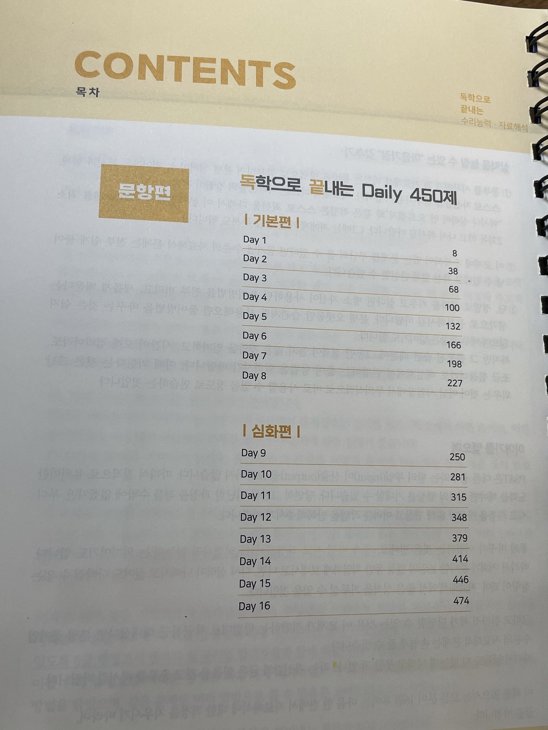 무려 460 문제로 구성되어 있습니다. 대략 30문제 정도씩 총 14일 분량인데 따로 영역이 나누어져 있지 않고 혼합된 문제로 되어 있어요.