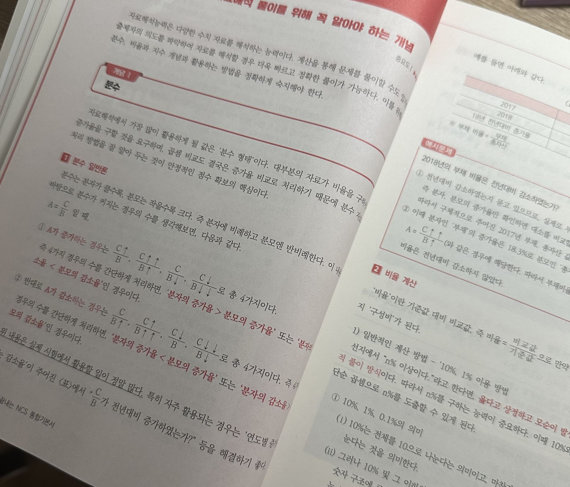 일단 자료해석 영역은 다양한 유형의 문제들이 있어 많은 문제들을 접하는 경험을 쌓을 수 있었습니다. 그리고 문제 풀이에 적용할 수 있는 방법이나 확률표 등 문제에 적용할 수 있는 요소들이 해설집에 잘 나와있어서 문제에 적용하기 좋았습니다. 또한 문제지 하루치 분량을 풀기 전에 있는 계산문제들을 통해서 간단한 워밍업을 하고 문제를 푸는 습관이 정말 도움이 많이 되었습니다.