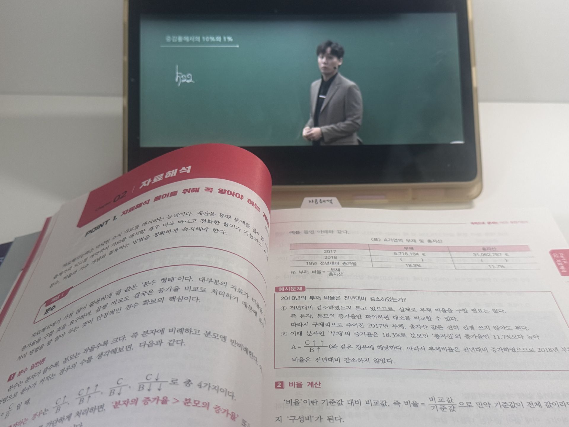 그리고 강의를 듣는데 이해도 더 잘되고 한 번더 머리 속에 각인 시킬 수 있어서 강의를 듣기 잘했다는 생각이 들었습니다. 그리고 특히 수리, 자료해석 부분에서는 어림산하는 방법을 읽히는데 강의 도움을 많이 받았습니다. 수리부분이 늘 약해서 문제를 풀 때 시간이 너무 오래걸렸었습니다. 그래서 수리는 포기해야되나 싶었는데 강의보면서 계산하는 방법을 다시 익히고 차근차근 하니까 그 전보다는 훨 빨라졌습니다. 아직 더 많이 노력해서 학습해야 강사님께서 말씀하신 시간이 걸릴거 같긴하지만 예전에 비하면 많은 발전이라고 생각합니다.
