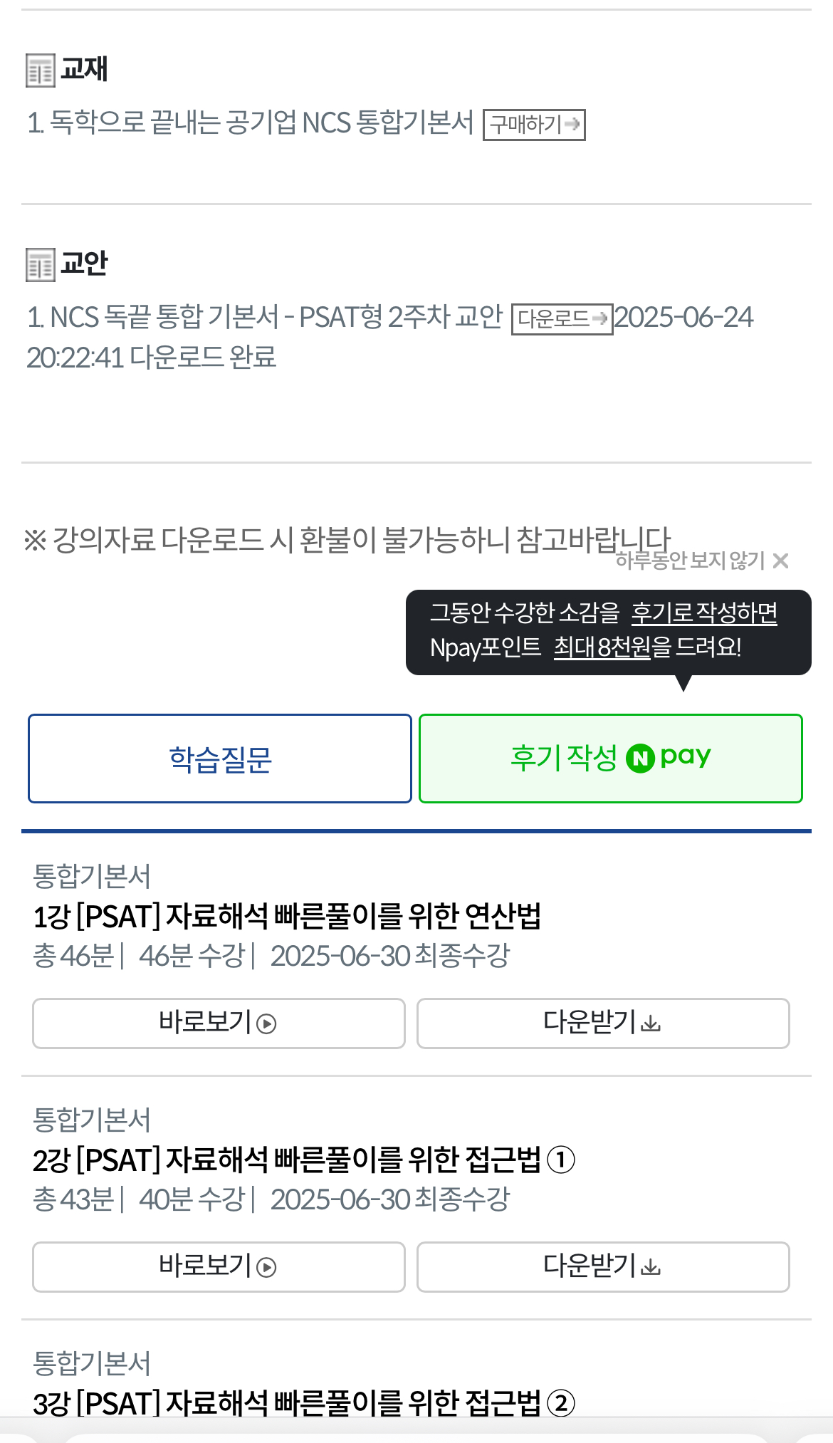 통합기본서인만큼 범위가 굉장히 넓고 양이 많음에도 불구하고 차근차근 강의를 통해 개념을 보다 쉽게 배우며 바로 문제를 풀어 볼 수 있어서 학습에 많은 도움이 되었습니다. 강의가 굉장히 이해하기 쉽게 구성되어 있어 학습에 도움이 되었고 실전에서 사용할 수 있는 팁도 말씁해주셔서 좋았습니다. psat유형을 다양한 유형과 문제로 풀어보면서 기본적인 개념에 대해 자신감이 생긴 것 같고 독끝 통합기본서 자체도 해설지가 굉장히 친절하기 때문에 굉장히 추천드리는 강의입니다. 앞으로도 꾸준히 차근차근 공부해서 ncs 고수로 거듭나겠습니다.