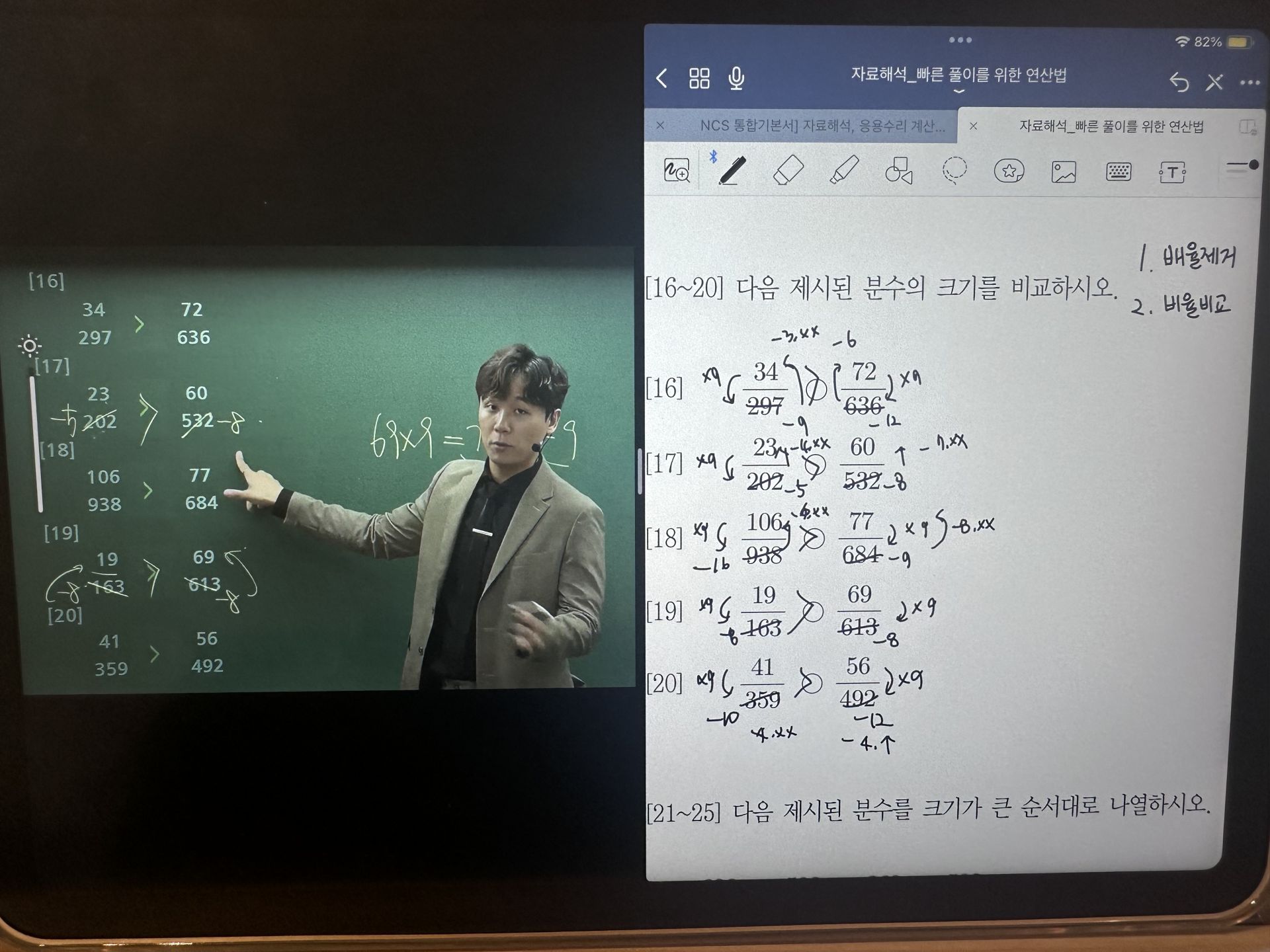 둘째, 박수웅 강사님의 설명이 몹시 상세합니다. 스터디를 통해 무료로 제공받았지만, 역시 무료로 듣기에는 아깝습니다. 피셋을 처음 공부하던 시절 문제풀이에 컴팩트한 연산법을 익히느라 고생하곤 했습니다. 강의를 들어도 수강생 전부가 다 이해할 거라는 듯 뭉뚱그려져 지나갔고, 강의 교재를 사도 강의 없이는 효율적으로 풀이할 수 없게끔 제작된 교재가 많이 접하곤 했습니다. 그런데 박수웅 강사님께서는 수의 대소비교를 아주 기초부터 제대로 떠 먹여 주십니다. 덕분에 네이버 블로그 등 여러 사이트를 전전하며 계산 식이나 풀이 시간을 어떻게 줄일까 고민하지 않아도 되게 되었습니다. 게다가 독끝 교재와 강사님 설명을 함께 하니 기초 학습도, 연습도 계획된 시간 내에 이뤄져서 좋았습니다.