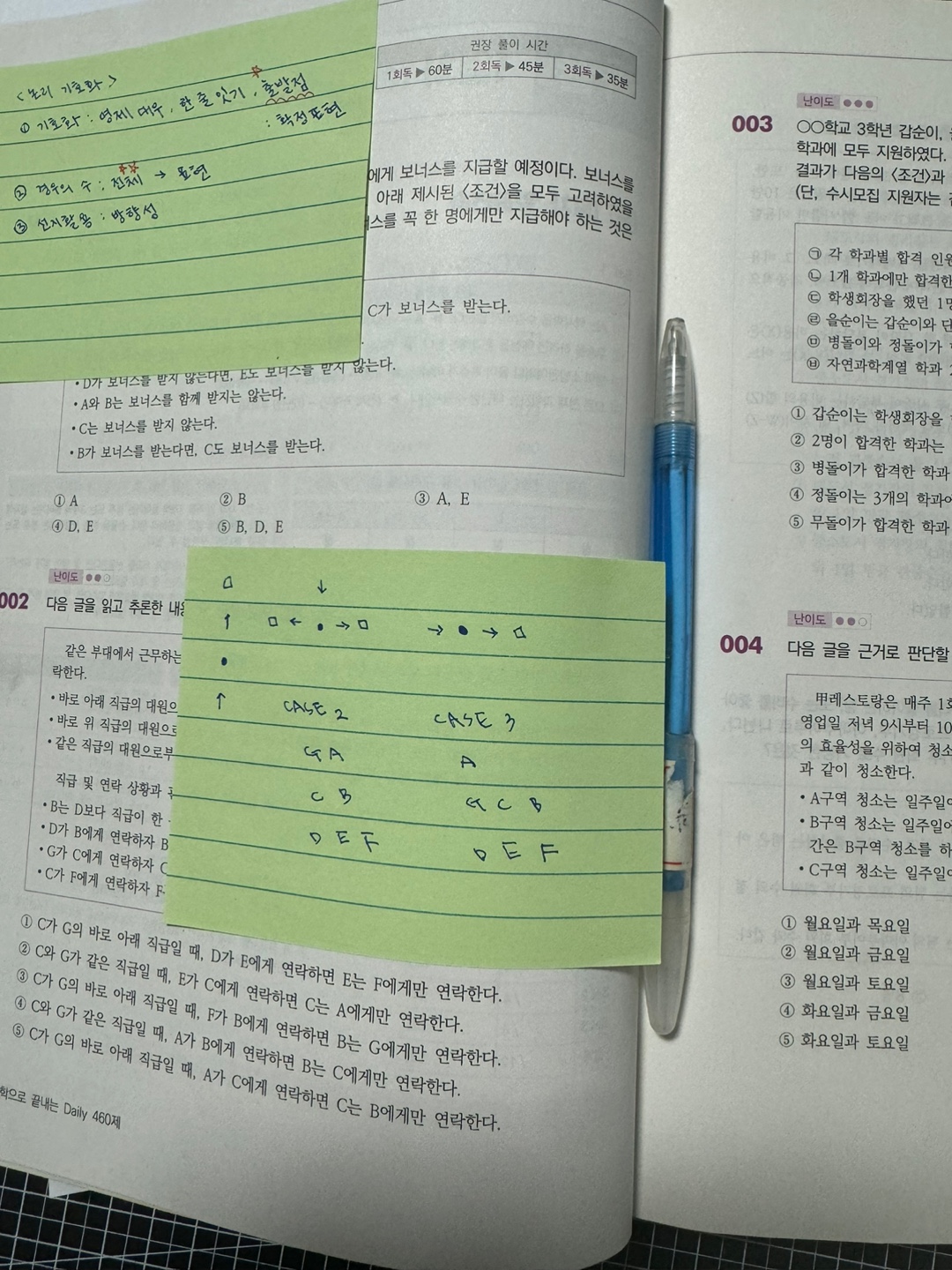 저는 기본서를 공부할 때부터 논리 문제를 많이 틀려서 문제 해결 + 자원관리 영역이 가장 도움이 많이 되었습니다. 문제지의 하루치 분량 문제를 시작하기 전에 간단한 논리 문제 등의 문제들을 풀고 문제 풀이를 시작하는 게 문제 풀이 루틴을 만드는 데 도움이 되었습니다. 자원관리 영역의 문제를 풀면서 논리 문제에 대해 접근하는 방법뿐만 아니라 다른 유형의 문제들에 대한 풀이법, 시간 단축 팁도 잘 나와있어서 좋았습니다. 그리고 문제를 풀면서 논리문제가 아닌 제가 약한 유형의 문제들이 있는지 파악하기 쉬웠습니다.