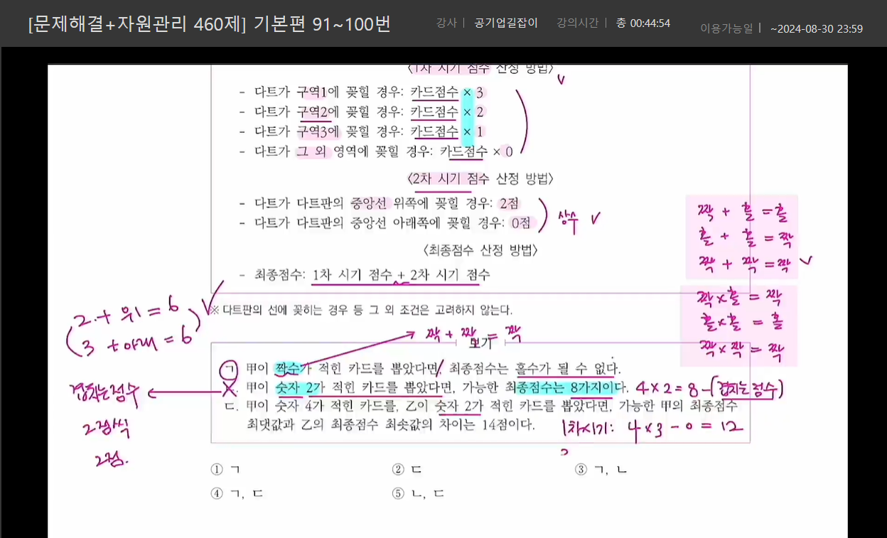 어렵게 다가왔던 문제해결 파트도 문제 유형별 접근법과 풀이 과정, 교재에 없는 꿀팁들을 중간중간 설명해주셨어요. 이 파트는 기본 내용 학습 이후 많은 문제 풀이를 통해 익숙해져야 한다고 여러번 강조하신만큼 시험장에 가서도 바로바로 대처할 수 있도록 연습하겠습니다.