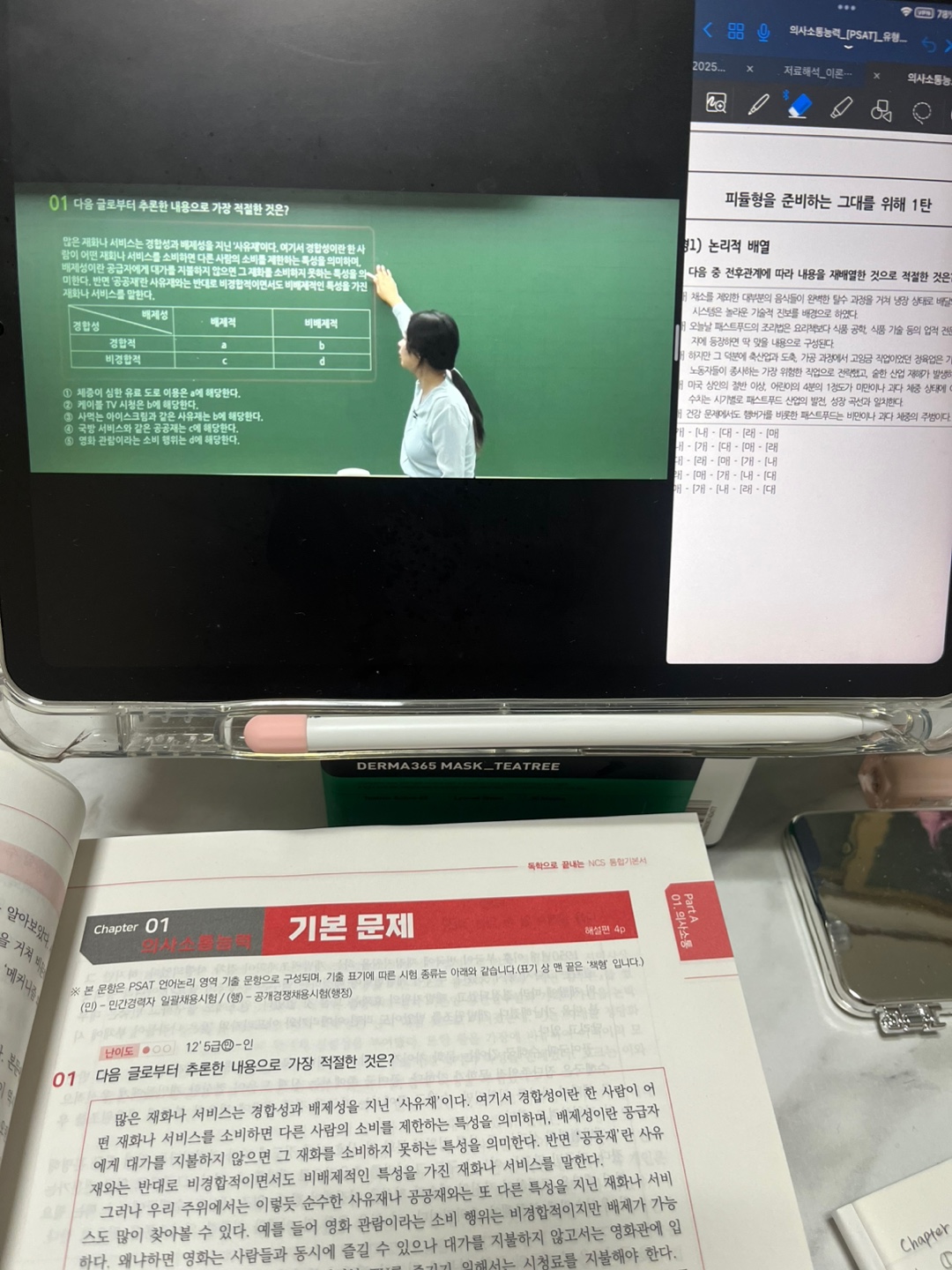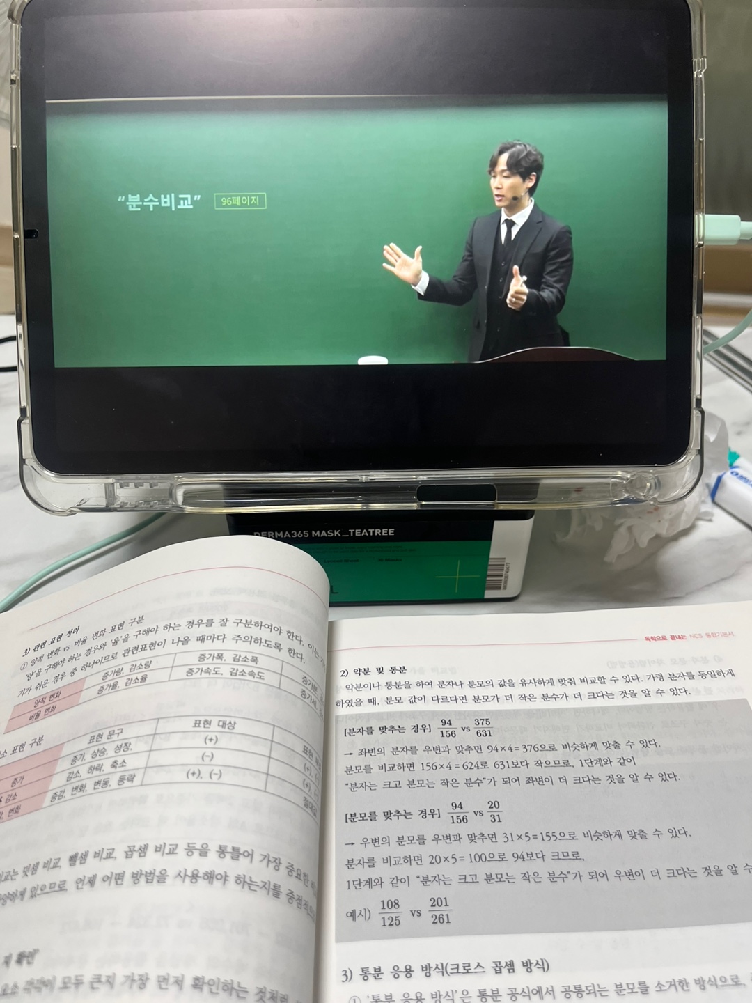 그리고 강의를 듣는데 이해도 더 잘되고 한 번더 머리 속에 각인 시킬 수 있어서 강의를 듣기 잘했다는 생각이 들었습니다. 그리고 특히 수리, 자료해석 부분에서는 어림산하는 방법을 읽히는데 강의 도움을 많이 받았습니다. 수리부분이 늘 약해서 문제를 풀 때 시간이 너무 오래걸렸었습니다. 그래서 수리는 포기해야되나 싶었는데 강의보면서 계산하는 방법을 다시 익히고 차근차근 하니까 그 전보다는 훨 빨라졌습니다. 아직 더 많이 노력해서 학습해야 강사님께서 말씀하신 시간이 걸릴거 같긴하지만 예전에 비하면 많은 발전이라고 생각합니다.