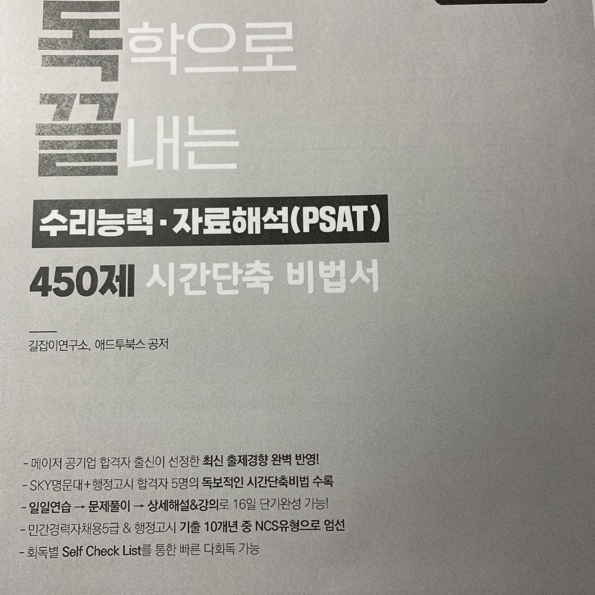 일단 자료해석 영역은 다양한 유형의 문제들이 있어 많은 문제들을 접하는 경험을 쌓을 수 있었습니다. 그리고 문제 풀이에 적용할 수 있는 방법이나 확률표 등 문제에 적용할 수 있는 요소들이 해설집에 잘 나와있어서 문제에 적용하기 좋았습니다. 또한 문제지 하루치 분량을 풀기 전에 있는 계산문제들을 통해서 간단한 워밍업을 하고 문제를 푸는 습관이 정말 도움이 많이 되었습니다.