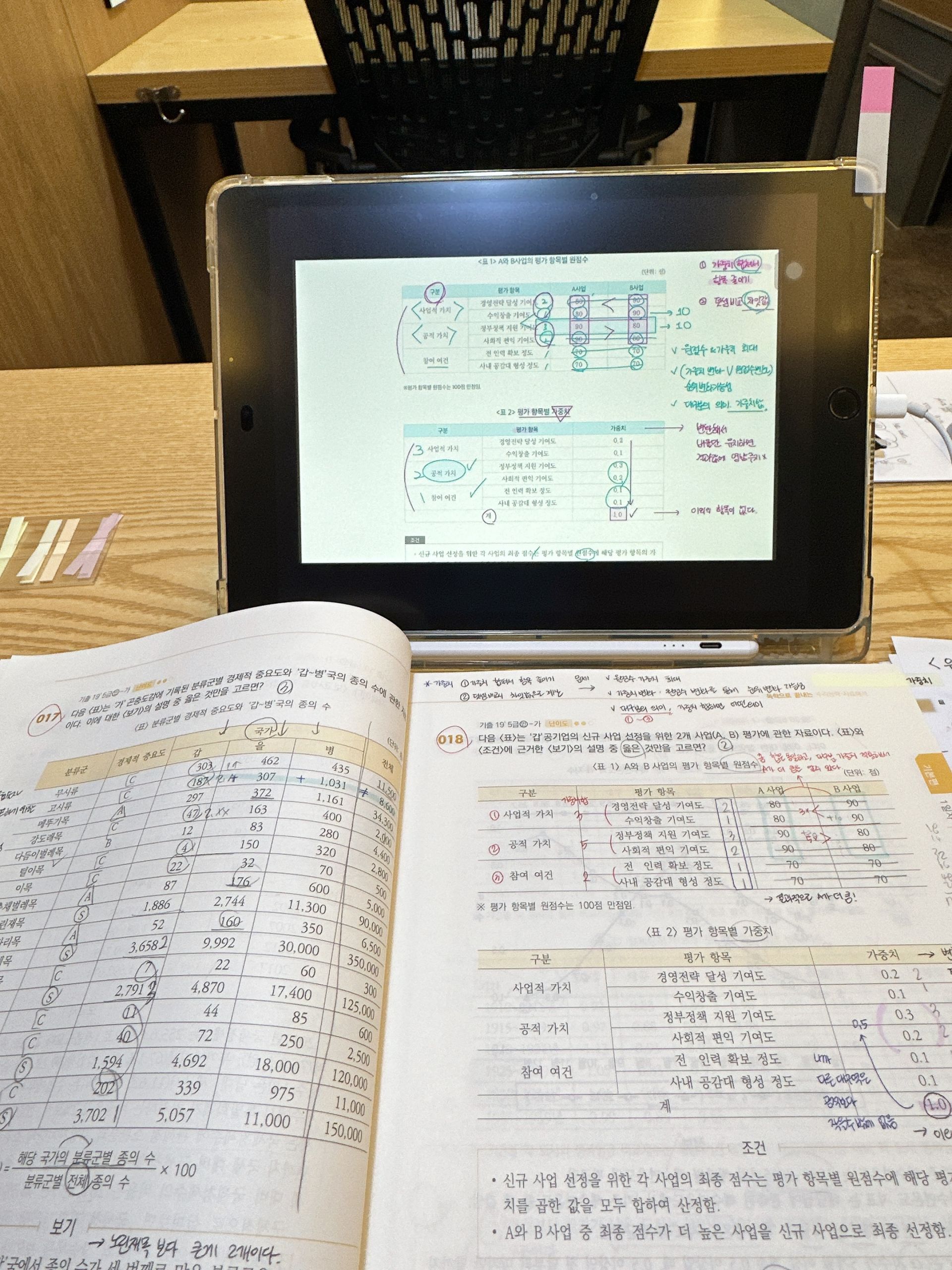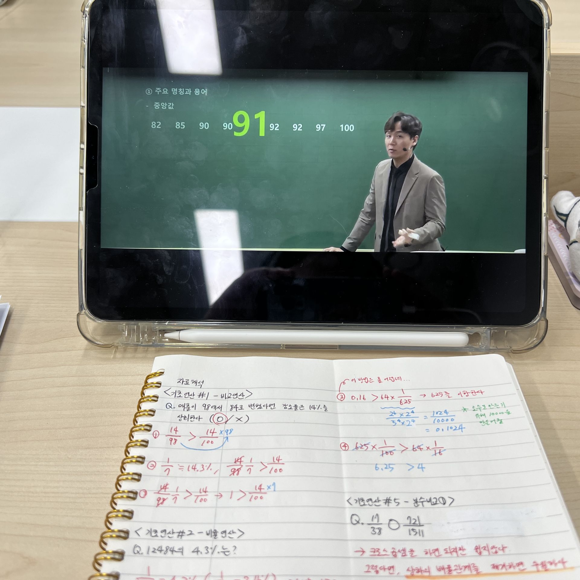 그리고 강의를 듣는데 이해도 더 잘되고 한 번더 머리 속에 각인 시킬 수 있어서 강의를 듣기 잘했다는 생각이 들었습니다. 그리고 특히 수리, 자료해석 부분에서는 어림산하는 방법을 읽히는데 강의 도움을 많이 받았습니다. 수리부분이 늘 약해서 문제를 풀 때 시간이 너무 오래걸렸었습니다. 그래서 수리는 포기해야되나 싶었는데 강의보면서 계산하는 방법을 다시 익히고 차근차근 하니까 그 전보다는 훨 빨라졌습니다. 아직 더 많이 노력해서 학습해야 강사님께서 말씀하신 시간이 걸릴거 같긴하지만 예전에 비하면 많은 발전이라고 생각합니다.