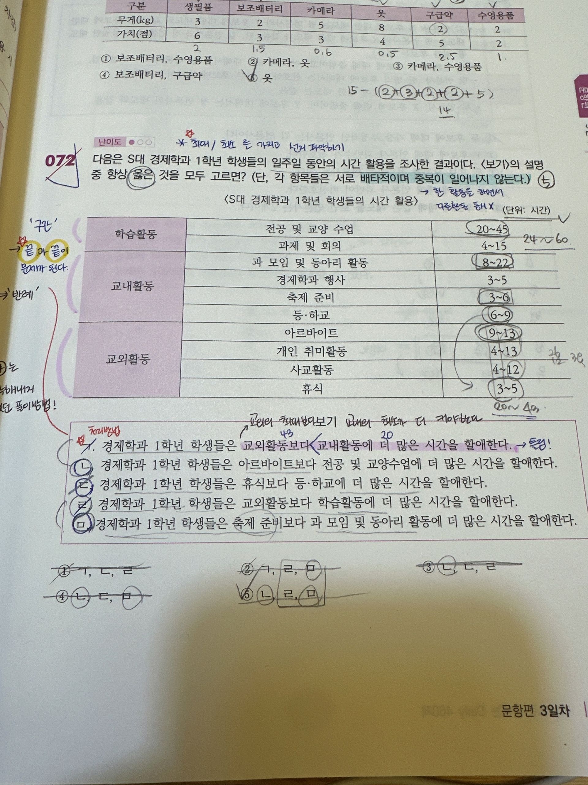 저는 기본서를 공부할 때부터 논리 문제를 많이 틀려서 문제 해결 + 자원관리 영역이 가장 도움이 많이 되었습니다. 문제지의 하루치 분량 문제를 시작하기 전에 간단한 논리 문제 등의 문제들을 풀고 문제 풀이를 시작하는 게 문제 풀이 루틴을 만드는 데 도움이 되었습니다. 자원관리 영역의 문제를 풀면서 논리 문제에 대해 접근하는 방법뿐만 아니라 다른 유형의 문제들에 대한 풀이법, 시간 단축 팁도 잘 나와있어서 좋았습니다. 그리고 문제를 풀면서 논리문제가 아닌 제가 약한 유형의 문제들이 있는지 파악하기 쉬웠습니다.