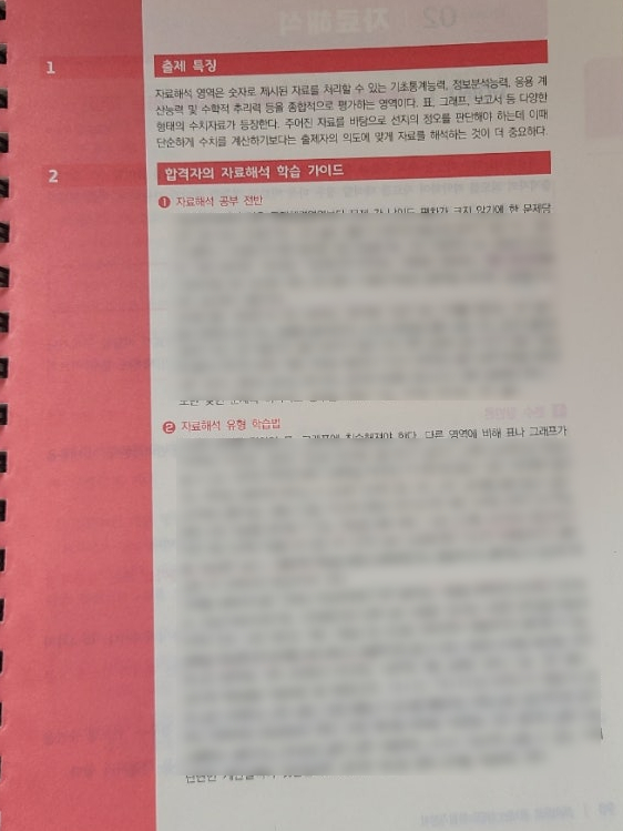 일단 자료해석 영역은 다양한 유형의 문제들이 있어 많은 문제들을 접하는 경험을 쌓을 수 있었습니다. 그리고 문제 풀이에 적용할 수 있는 방법이나 확률표 등 문제에 적용할 수 있는 요소들이 해설집에 잘 나와있어서 문제에 적용하기 좋았습니다. 또한 문제지 하루치 분량을 풀기 전에 있는 계산문제들을 통해서 간단한 워밍업을 하고 문제를 푸는 습관이 정말 도움이 많이 되었습니다.