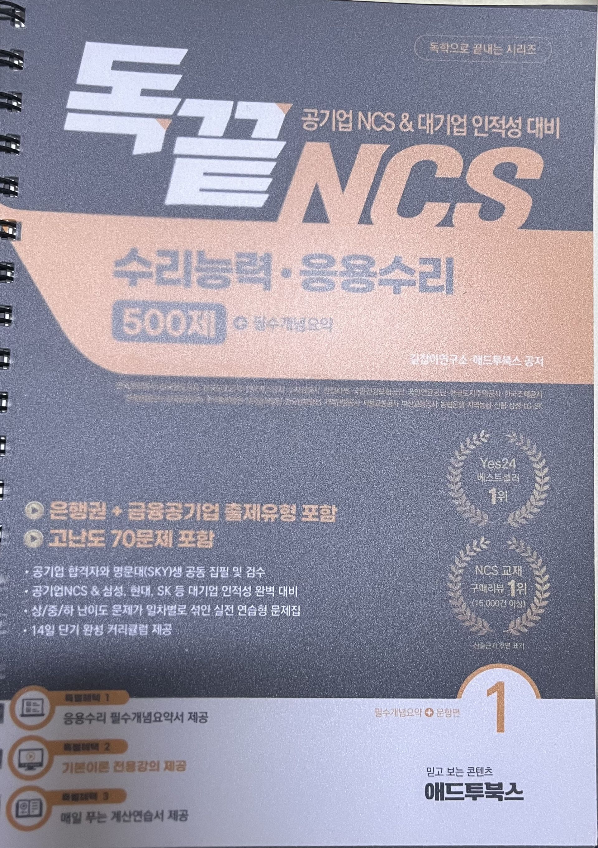 일단 NCS 초보자로서 기본 인강을 들어볼 필요가 있겠다고 느꼈고, 애드투 (박수웅·길자은 독끝 NCS 통합 기본서 이론+문풀(모듈편+피셋편)) 인강을 구매했습니다. 두 분이 파트별로 나누어 강의 진행해주십니다. NCS를 처음 접하는 입장에선 박수웅 강사님의 계산 팁들이 매우 유익했습니다. 500제 인강도 들어보고 싶을 정도로요.. 특히 응용수리가 좋습니다. 속력문제, 소금물문제, 일률문제뿐 아니라 배수문제나 몰아주기 방식 등도 알려주셔서 도움이 많이 됩니다.