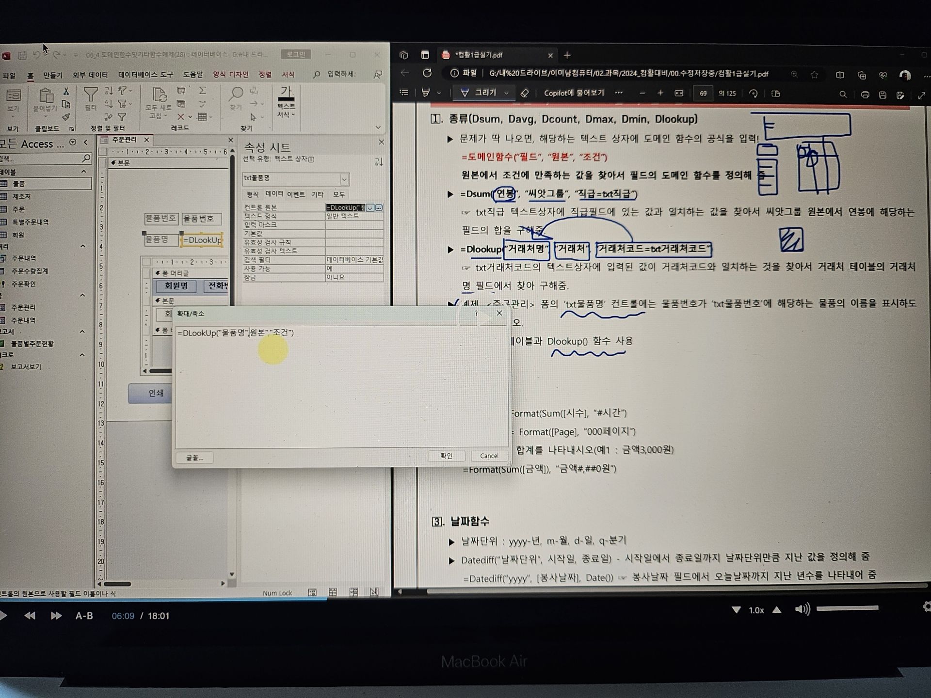 오늘 공부한 도메인 함수, Format 함수, 날짜 함수, 기타 함수 부분은 액세스에서 계산 방식이 어떻게 작동하는지 감을 잡는 데 큰 도움이 됐다.