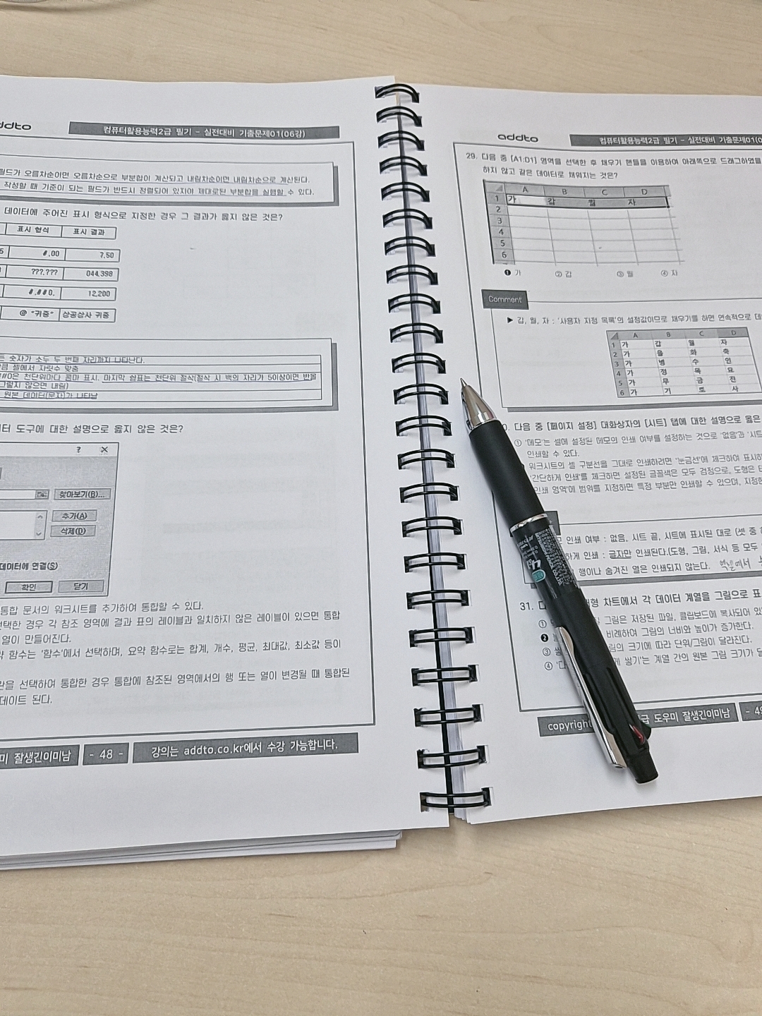 인강과 함께 제공되는 교재도 큰 장점이라고 느꼈습니다. 교재에는 이론이 깔끔하게 정리되어 있고, 실기 연습 문제와 기출 유형이 함께 수록되어 있어 강의 내용을 바로 복습하기에 좋았습니다. 저는 인강을 들을 때 교재를 옆에 두고 중요한 부분에 표시하면서 수강했고, 강의 수강 후에는 교재 문제를 직접 풀어보며 실습 위주로 공부했습니다. 틀린 문제는 다시 애드투 이미남 컴활 1급 인강을 보며 왜 틀렸는지 정리했습니다.